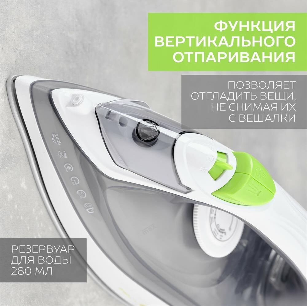 Мощность, Вт: 2400 Световой индикатор работы: Да Регулируемый пар до г/мин: 35 Паровой удар до г/мин: 140 Резервуар для воды, мл: 280 Функция разбрызгивания воды: Да Терморегулятор: Да Вертикальное отпаривание: Да Регулировка степени отпаривания: Да Покрытие подошвы: Керамическая подошва KeramoPro Самоочистка: Да Система защиты от накипи ANTI-CALC: Да Система защиты от капли ANTI-DRIP: Да Размер утюга Ш*В*Г, мм: 120*140*289 Шарнирное крепление шнура: Да Длина электрошнура, м: 1.8 Цвет шнура: Белый Цвет: Белый