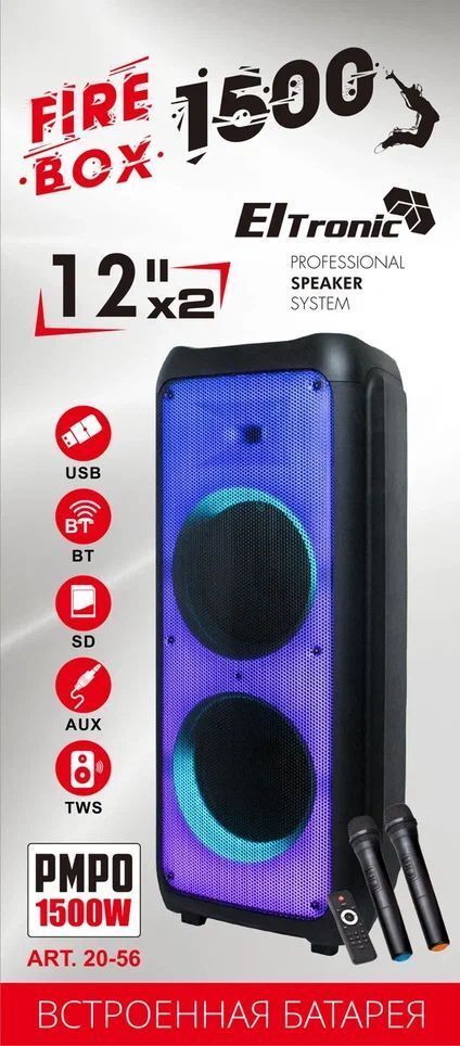 Акустическая колонка, Bluetooth - FM - Внешний накопитель - Aux Мощность: - RMS 150 Ватт - PMPO 1500 Ватт - Диапазон частот 100Hz-20KHz Питание: - 220V - Встроенный аккумулятор 12V 12000 mAh (до 5 часов работы) Разъемы: - USB - SD + microSD - AUX - Jack 6.3 мм (микрофон-гитара) 2 шт. Комплектация: - Колонка - 2 Беспроводных микрофона - Пульт ДУ - Инструкция Размеры: Ширина - 46 см Высота - 41 см Глубина - 105 см Дополнительно: LED посветка Регулировка громкости микрофона Дисплей Приоритет микрофона Регулировка эхо микрофона Удобная ручка для переноски Колесики. "