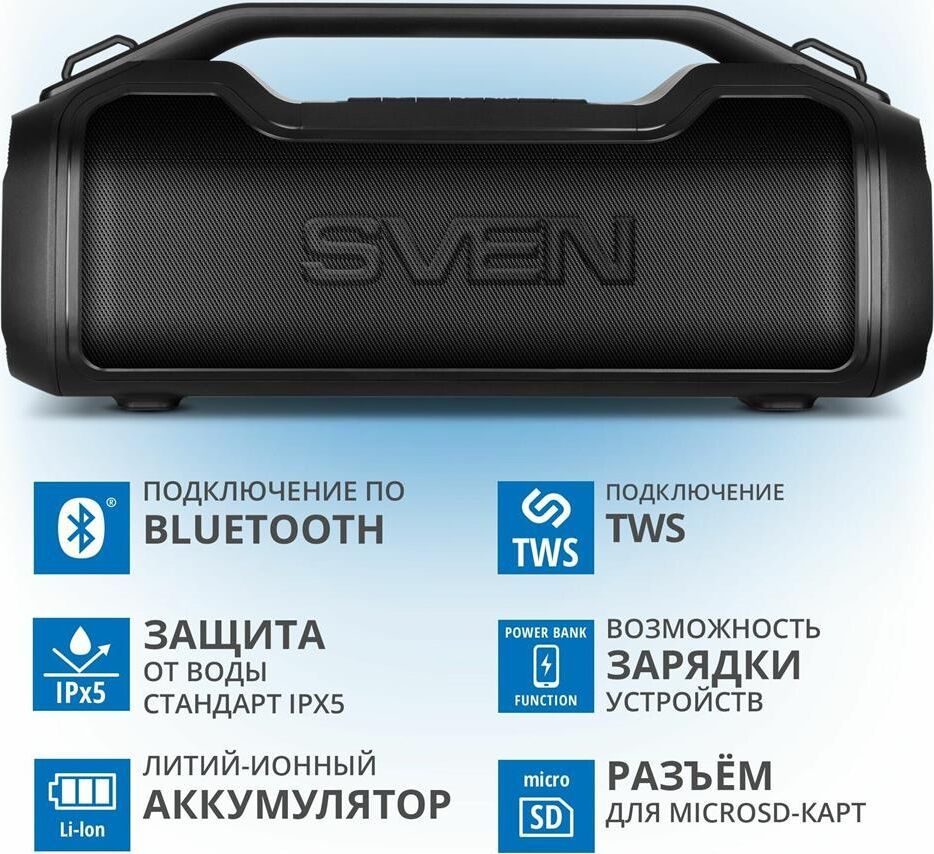 Выходная мощность (RMS), Вт 50 (2x25) Частотный диапазон, Гц 50 – 20 000 Размеры динамиков, мм 85, Беспроводная передача сигнала по Bluetooth, Воспроизведение музыки с носителей памяти microSD, Источник питания литий-ионный aккумулятор: 3600 мA · час (2 шт.) USB: DC 5 V Номинальный ток потребления, А 0,76 Тип соединения Bluetooth, проводной Радиус действия, м до 10 Размеры изделия (ШхВхГ), мм 390х137х175 Вес, г 2700 Цвет черный