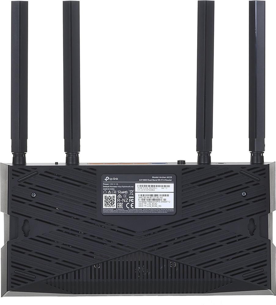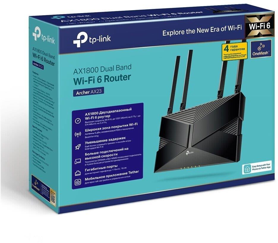 Входной интерфейс: 10/100/1000BASE-TX. Предназначено для установки: в помещениях. Количество выходных портов 10/100/1000BASE-TX: 4. Кол-во портов WAN: 1. Количество диапазонов: двухдиапазонный. Цвет: черный. Количество ядер процессора: 2. Максимальная скорость по всем WiFi диапазонам: 1775. Количество внутренних и внешних антенн: 4. Тип антенн: внешние, несъемные. Для геймеров: да. Класс WiFi: AX1800. Скорость 802.11ax, 2.4 ГГц: 574. Скорость 802.11ax, 5 ГГц: 1201. Комплектация: Wi-Fi роутер Archer AX23 Адаптер питания Кабель Ethernet RJ45 Руководство по быстрой настройке. Габариты упаковки (ед) ДхШхВ: 0.331x0.24x0.08. Вес упаковки (ед): 1.64. Страна производства: Китай. Влажность воздуха при эксплуатации: 10-90% без конденсата. Диапазоны частот: 2.4/5. Кол-во портов LAN: 4. Количество одновременно работающих диапазонов: 2. Многопотоковая передача данных: MU-MIMO. Рабочая температура: от 0 до +40. Скорость передачи по проводному подключению (LAN) (макс.): 1000. Скорость передачи по проводному подключению (WAN) (макс.): 1000. Коэффициент усиления Wi-Fi антенны, (макс.): 5. Мощность передатчика: 20. Количество внешних антенн: 4. Гарантия: 48 мес.. Размер (ШхВхГ): 260.2 х 38.6 х 135 мм. Фильтрация: по IP-адресам, по MAC-адресам, по URL. Стандарты Wi-Fi (5 ГГц): 802.11a, 802.11ac, 802.11ax, 802.11n. Режимы работы: маршрутизатор, точка доступа. Безопасность Wi-Fi: WPA, WPA2, WPA3. Поддержка технологий: Airtime Fairness, Beamforming, DHCP-сервер, Dynamic DNS (DDNS), MESH, QoS, UP…