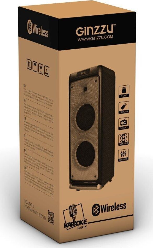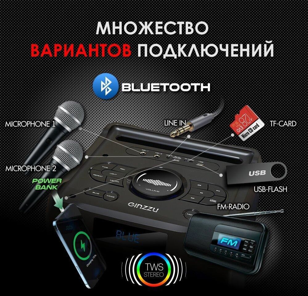 MIDI-система, Bluetooth, выходная мощность (RMS) - 120Вт., динамики НЧ/СЧ - 2 х 8 дюймов, ВЧ - 1 х 2 дюйма, МEGABASS - функция увеличения низких частот., КАРАОКЕ функция - два микрофона. ДИНАМИЧЕСКАЯ RGB подсветка динамиков - 7 режимов.ЭКВАЛАЙЗЕР.Аккумулятор 12V /7500 мАч и питание от сети 220V. Bluetooth: V4.2.Поддержка режима TWS.Функция POWERBANK (USB - 5V). FM РАДИО: 87,5-108,0 МГц.АУДИО-ПЛЕЕР: USB-flash и микро SD-card. AUX: DC-jack 3,5 мм.Пульт дистанционного управления.Диапазон воспроизводимых частот - 50 Hz - 18 kHz.