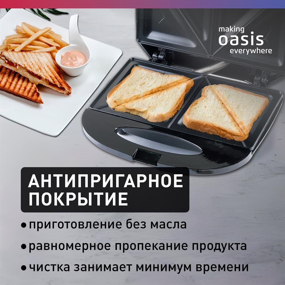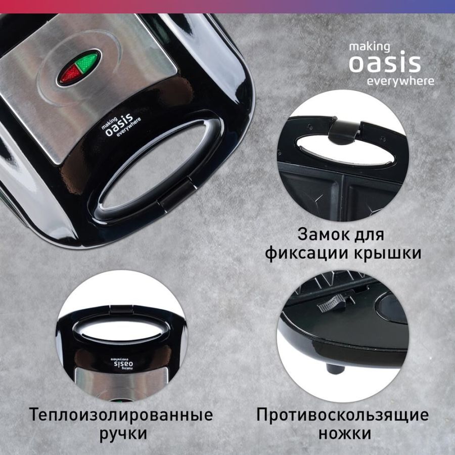 Параметры электросети, В/Гц 220-240 / 50 Мощность, Вт 800 Цвет черный Материал корпуса бакелит Количество съемных панелей 1 Размер изделия, мм 220×70×210 Антипригарное покрытие Автоматический температурный контроль Замок для фиксации крышки Индикаторы нагрева и сети Теплоизолированные ручки Противоскользящие ножки
