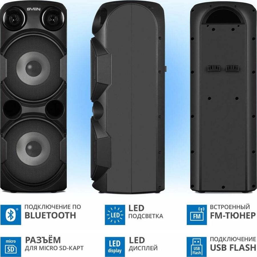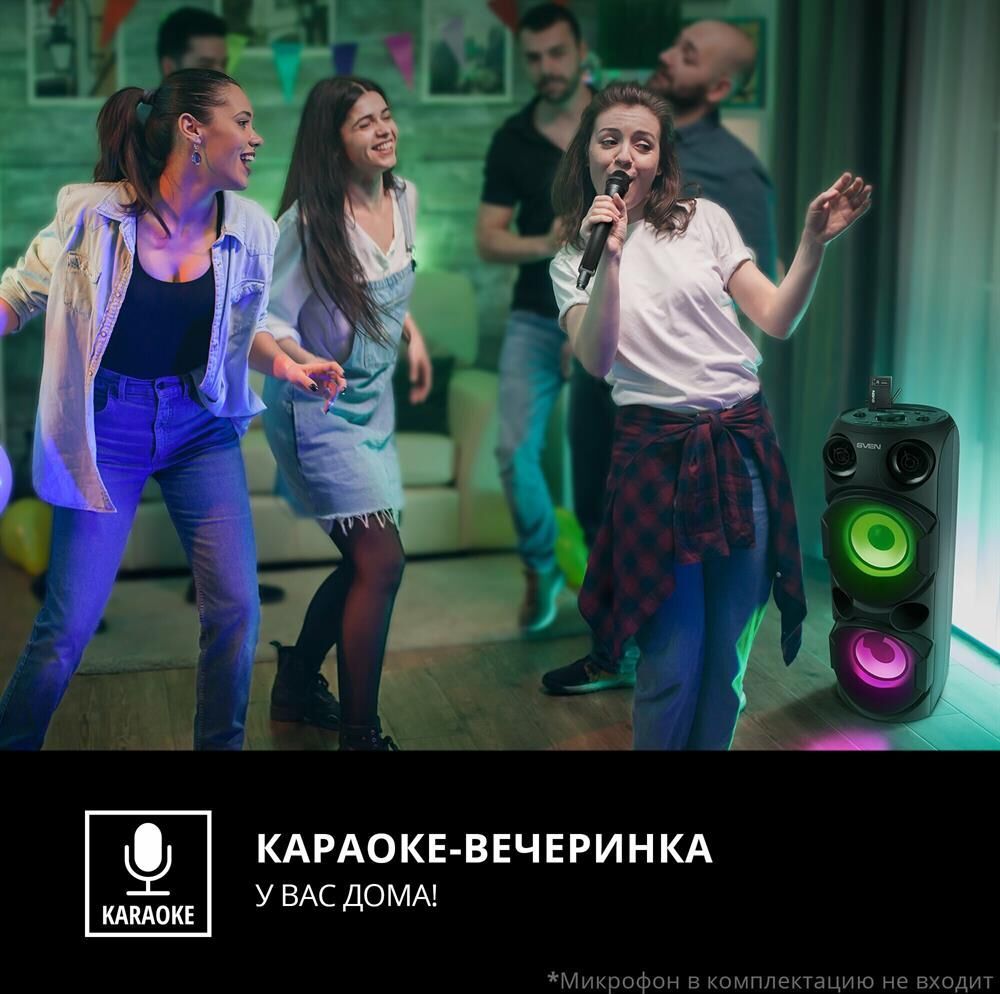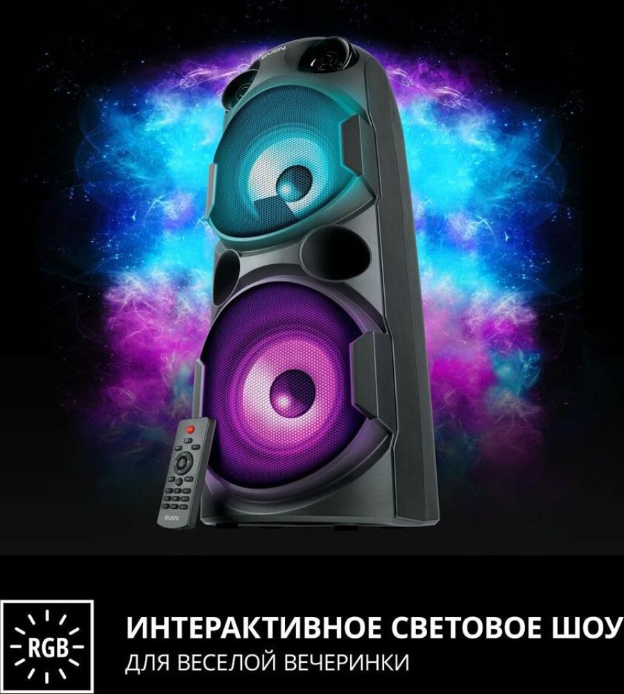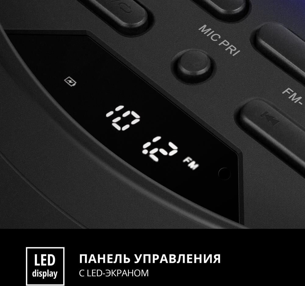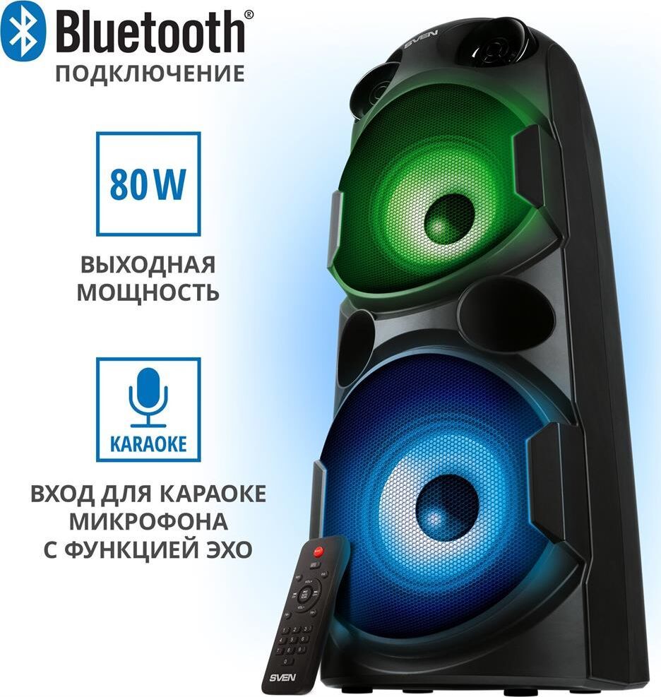 домашняя аудиосистема, система All-in-One, Основной цвет черный, Формат акустической системы 1.0, Мощность 80 Вт, Количество полос фронтальной акустики 2, Частотный диапазон 45 Гц - 22 кГц, Материал корпуса акустики пластик, Тип проигрывателя USB, Воспроизведение с USB накопителей, Поддерживаемые форматы WMA , MP3 , WAV , FLAC, Радиоприемник FM (87.5 - 108 МГц), Дисплей, Караоке, Регулировки- громкость эха , громкости микрофона , эквалайзер, LED подсветка колонок, Тип проводного соединения 3.5 jack , 6.3 jack, Беспроводные интерфейсы Bluetooth, вход для микрофона х 2, Устройство для чтения карт памяти SD, Питание от аккумулятора, Ёмкость встроенной батареи 8800 мА*ч, Напряжение питания 5В, Комплектация FM-антенна , пульт ДУ , документация , кабель питания, режим TWS , диаметр НЧ динамика 145 мм , диаметр ВЧ динамика 32 мм, ширина основного блока 230 мм, Высота основного блока 640 мм, Глубина основного блока 260 мм, Общий вес 5.2 кг
