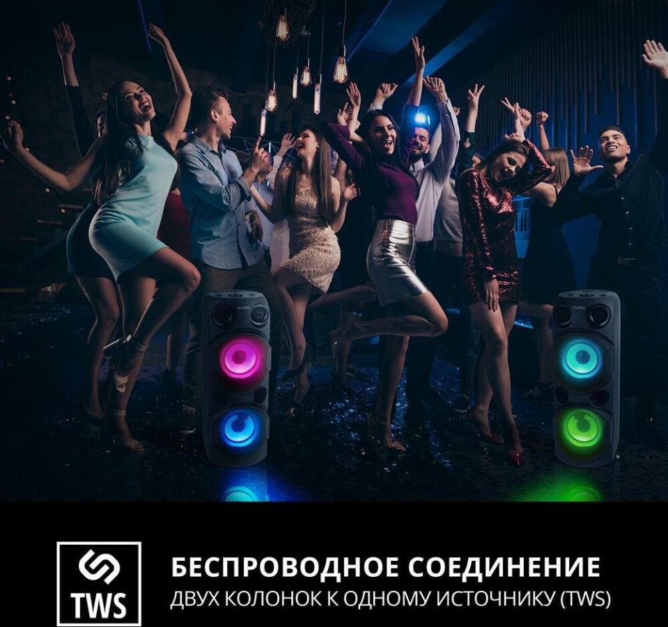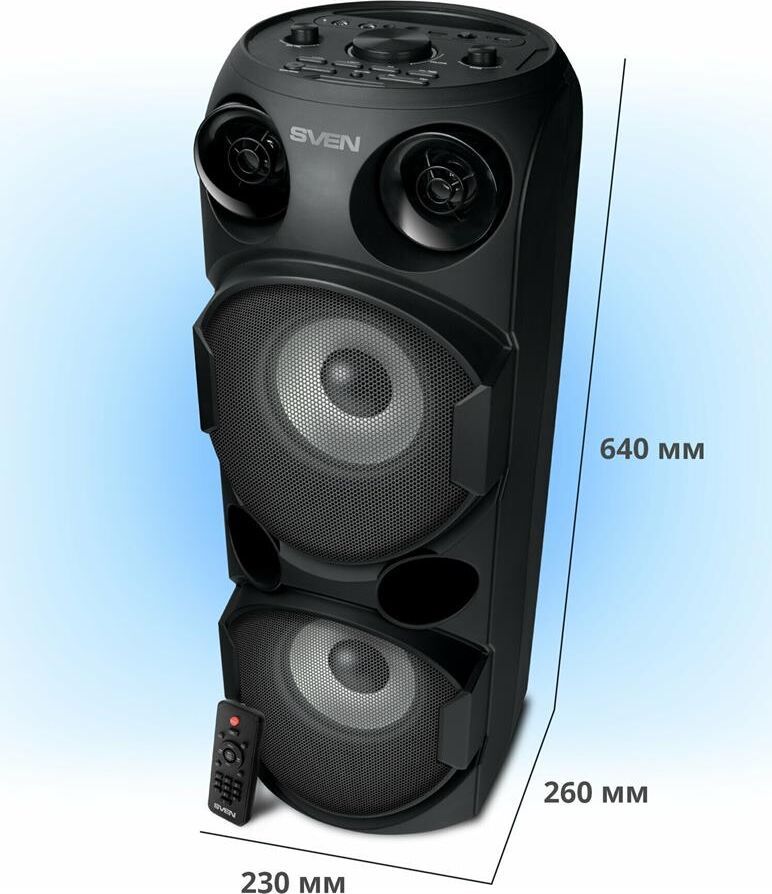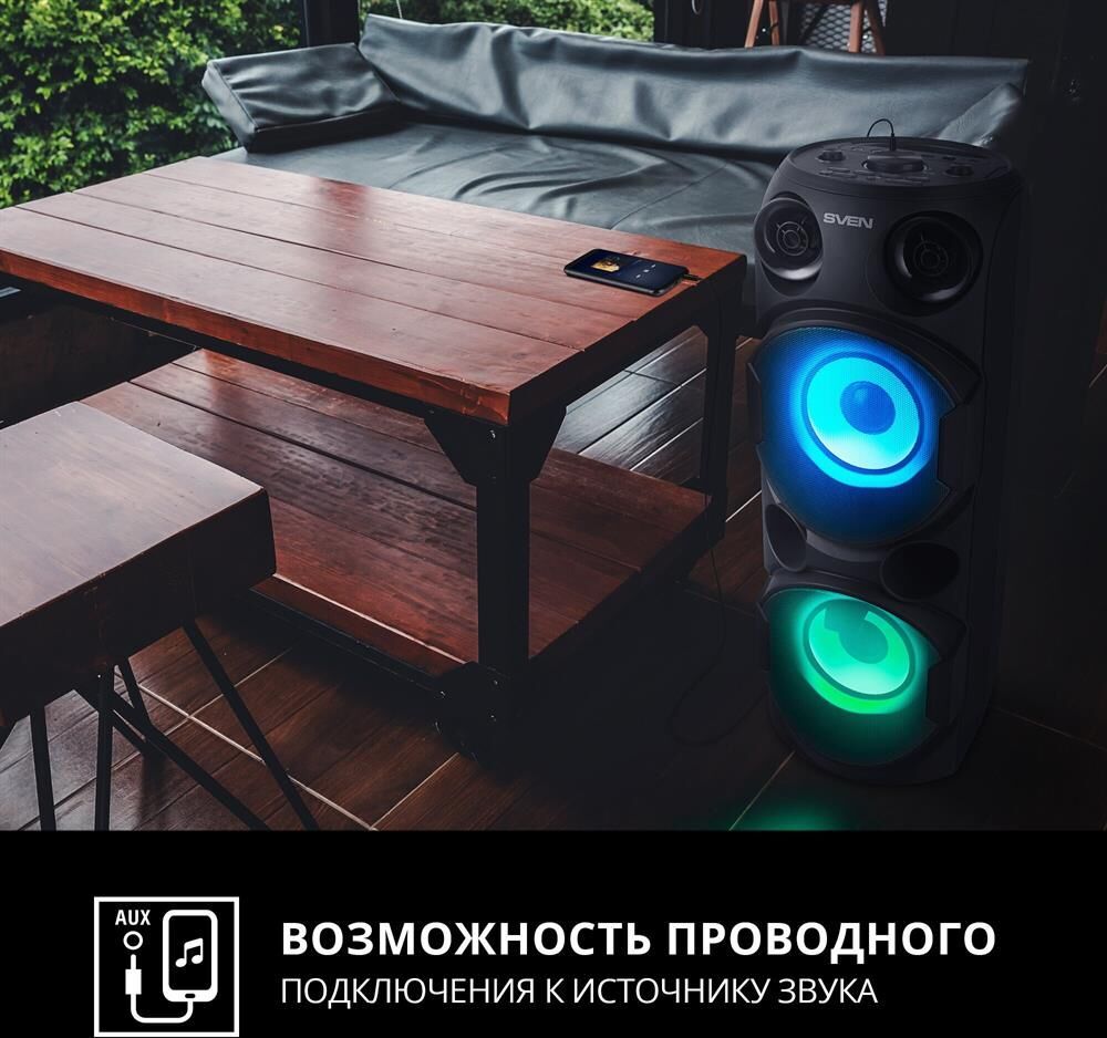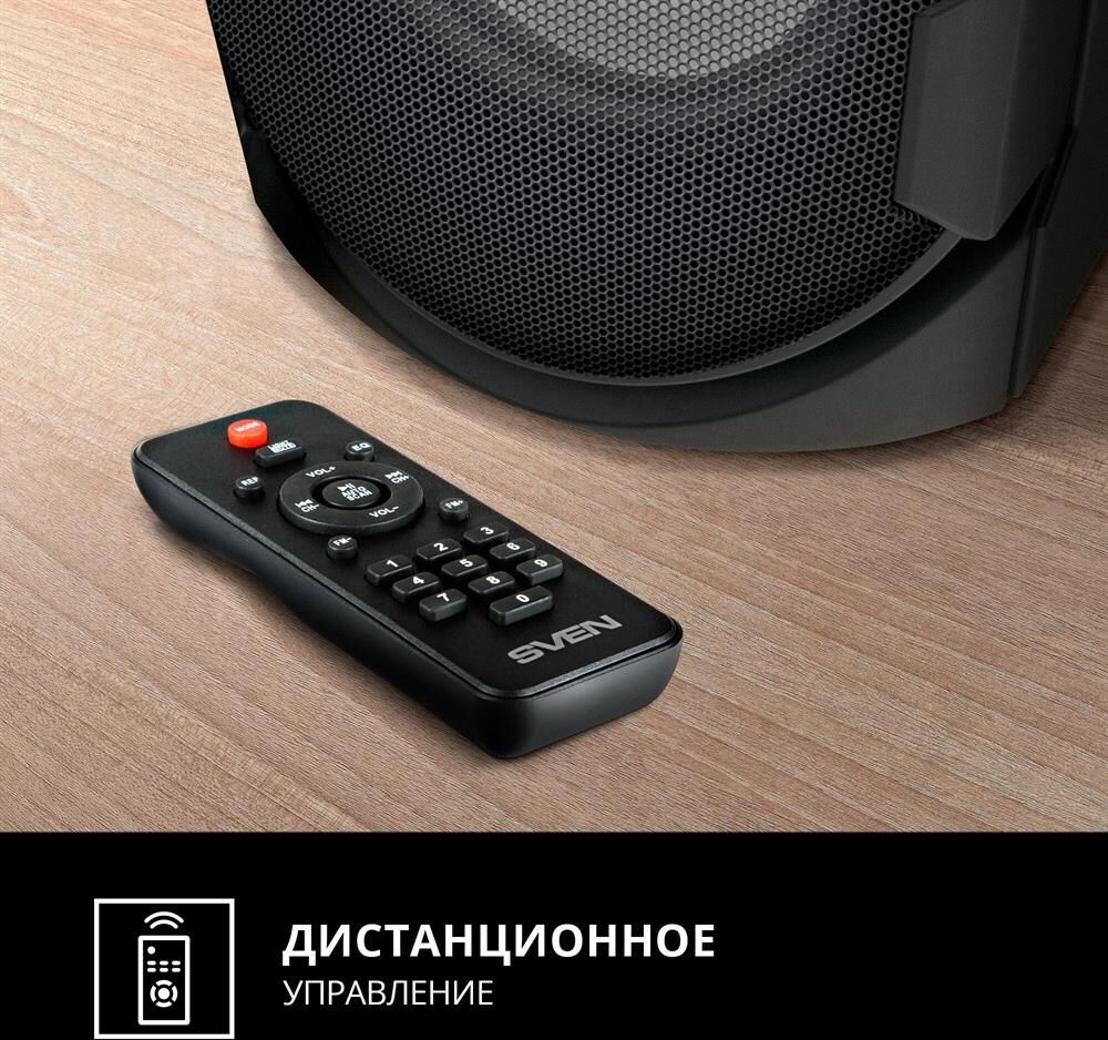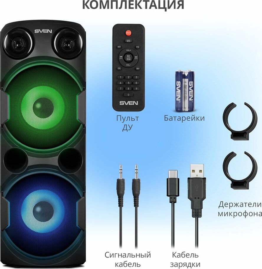 домашняя аудиосистема, система All-in-One, Основной цвет черный, Формат акустической системы 1.0, Мощность 80 Вт, Количество полос фронтальной акустики 2, Частотный диапазон 45 Гц - 22 кГц, Материал корпуса акустики пластик, Тип проигрывателя USB, Воспроизведение с USB накопителей, Поддерживаемые форматы WMA , MP3 , WAV , FLAC, Радиоприемник FM (87.5 - 108 МГц), Дисплей, Караоке, Регулировки- громкость эха , громкости микрофона , эквалайзер, LED подсветка колонок, Тип проводного соединения 3.5 jack , 6.3 jack, Беспроводные интерфейсы Bluetooth, вход для микрофона х 2, Устройство для чтения карт памяти SD, Питание от аккумулятора, Ёмкость встроенной батареи 8800 мА*ч, Напряжение питания 5В, Комплектация FM-антенна , пульт ДУ , документация , кабель питания, режим TWS , диаметр НЧ динамика 145 мм , диаметр ВЧ динамика 32 мм, ширина основного блока 230 мм, Высота основного блока 640 мм, Глубина основного блока 260 мм, Общий вес 5.2 кг
