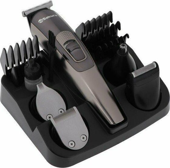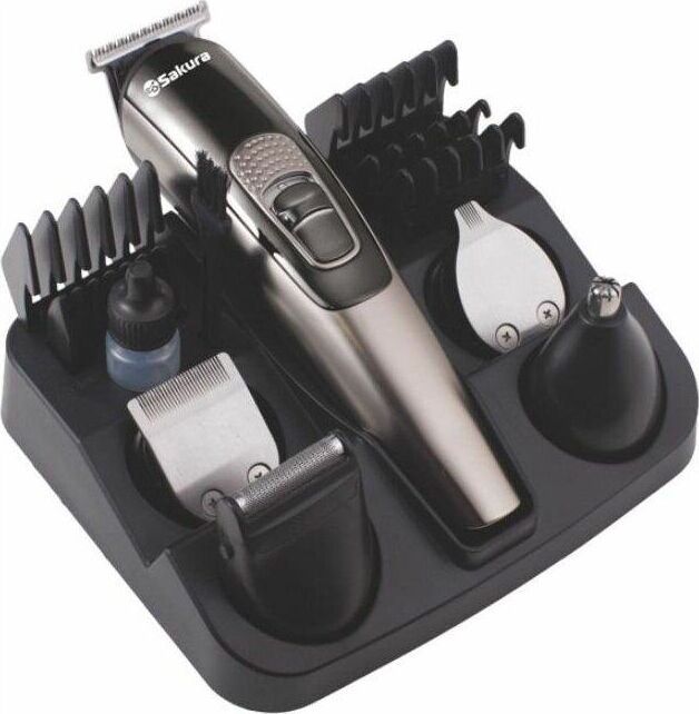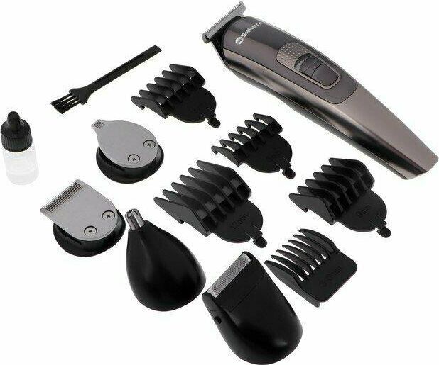 Триммер универсальный 5 в 1: для бороды, усов, бровей, ушей, носа, висков и т.д., 9 насадок в комплекте (4 гребней 3-12 мм, круглая насадка-триммер, 3 плоские насадки, насадка-бритва), автономная работа от аккумулятора до 45 минут без подзарядки, лезвия из стали, подставка для хранения.