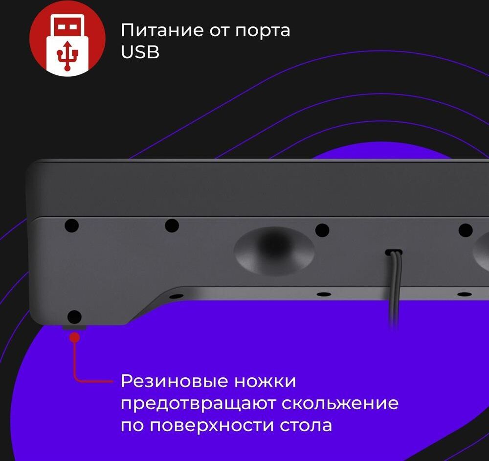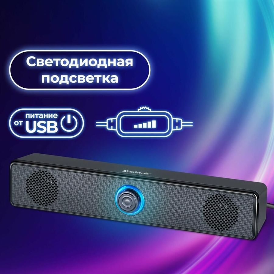 Компактные размеры - Акустическая система займет минимум места на рабочем столе Светодиодная подсветка регулятора громкости Питание от порта USB - Колонки не требуют сетевого источника питания. Просто подключите колонки к USB-разъему компьютера и наслаждайтесь звуком. Колонки необходимо подключить также к аудиоразъему вашего персонального компьютера, поскольку данная модель не оборудована интегрированной звуковой картой Резиновые ножки предотвращают скольжение по поверхности стола