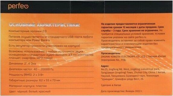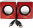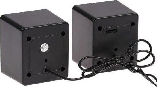 Компьютерные колонки 2.0. Питание осуществляется от стандартного USB порта любого компьютера или Power Bankа. Есть регулятор громкости (расположен на кабеле). Возможно использование с любым источником звука, оснащенным стандартным аудио выходом 3,5 мм (компьютер, планшет, смартфон, MP3 плеер). Динамики: 2”, 4 Ома. Диапазон частот: 40 – 20000 Гц. Мощность (RMS): 2 х 3 Вт. Габаритные размеры: 62 х 55 х 73 мм. Материал корпуса: пластик.