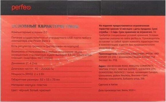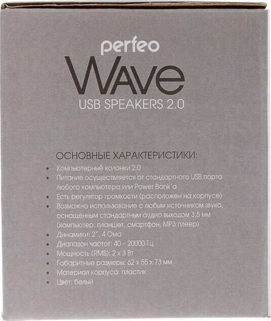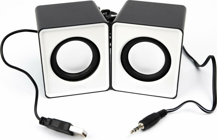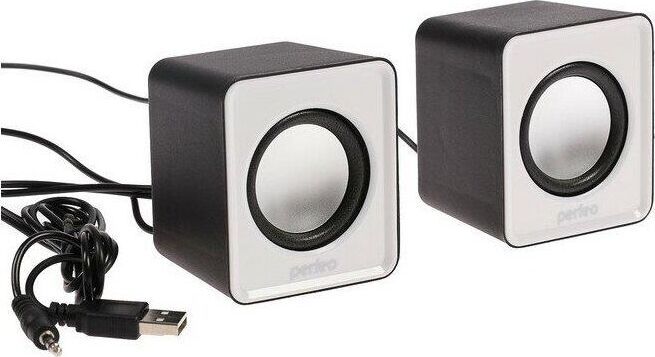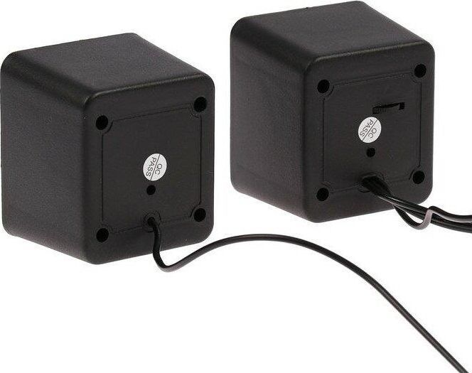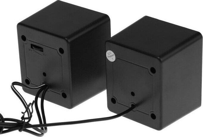 Компьютерные колонки 2.0. Питание осуществляется от стандартного USB порта любого компьютера или Power Bankа. Есть регулятор громкости (расположен на кабеле). Возможно использование с любым источником звука, оснащенным стандартным аудио выходом 3,5 мм (компьютер, планшет, смартфон, MP3 плеер). Динамики: 2”, 4 Ома. Диапазон частот: 40 – 20000 Гц. Мощность (RMS): 2 х 3 Вт. Габаритные размеры: 62 х 55 х 73 мм. Материал корпуса: пластик.