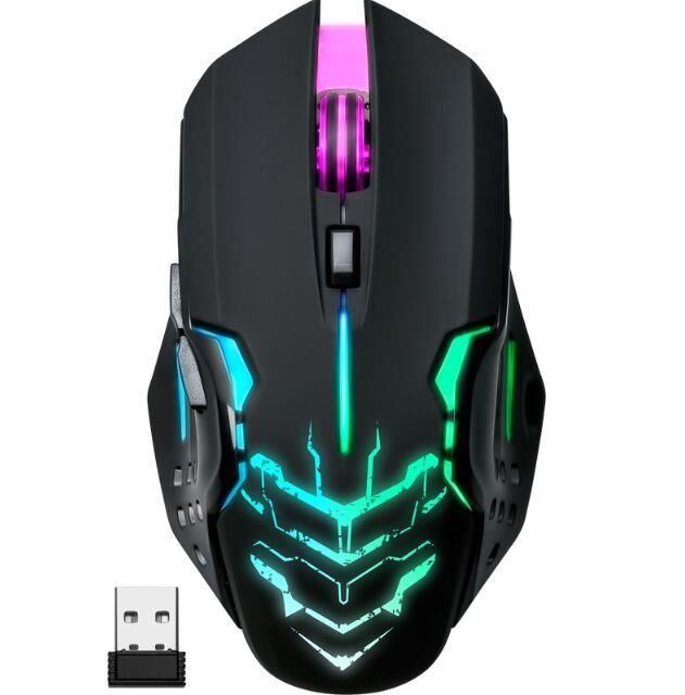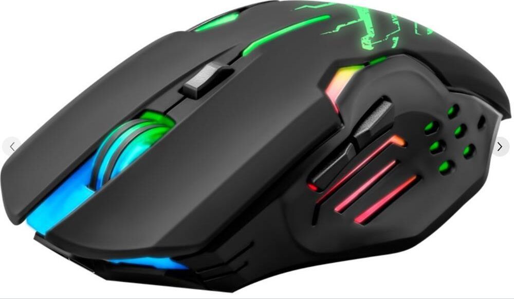 Мышь игровая, беспроводная, оптическая, интерфейс USB, 5 кнопок, колесо прокрутки, изменяемое разрешение - 1200/1600/2400/3200 dpi,2 дополнительные боковые кнопки, ферритовый фильтр помех, емкость аккумулятора - 400 мА ·ч, радужная подсветка, 5 настраиваемых кнопок, эргономичная форма обеспечивает удобный захват, бесшумные щелчки, тефлоновые ножки.