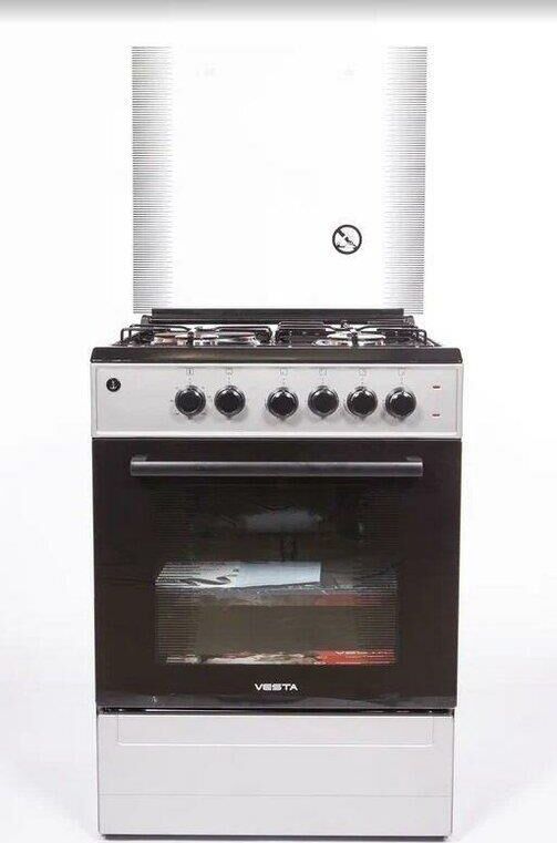Габариты: Высота 85 см, Глубина 60 см, Ширина 50 см. Цвет сeрый. Тип варочной поверхности комбинированная. Тип управления механическое. Переключатели поворотные. Варочная панель; Общее количество конфорок 4. Число электрических конфорок 1, Число газовых конфорок 3. Характеристики конфорок: Конфорки газовая, электрическая. Материал рабочей поверхности эмалированная сталь. Тип духовки электрическая. объем духовки 55 л, 3 режима духовки: Верхний нагрев, верхний+ нижний нагрев, нижний нагрев, мощность духовки: верхний ТЭН 1000 Вт, нижний 900 Вт. Есть стальные решетки, задняя крышка, материал задней крышки стекло, подсветка духовки.