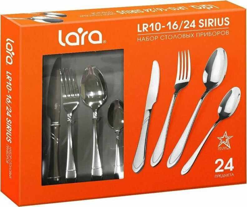 LARA LR10-16/24 LARA «SIRIUS» 24 пр Классический дизайн, широкие края рукоятки, доступная цена набора. Столовые приборы SIRIUS - то, каким должен быть традиционный столовый набор. Однако, толщина в 3 мм – это уже не просто предмет для повседневного использования, но еще стиль и качество. Столовые приборы LARA изготовлены из стали с 18-процентным содержанием хрома и имеют зеркальную полировку класса "А". Особое внимание уделено остроте зубьев вилки. Труднодоступные места между зубьями, в которых могут скапливаться остатки пищи, отполированы вручную так, чтобы сделать поверхность ровной и гладкой и повысить гигиеничность изделий. Глубина столовой ложки не менее 7 мм, и это обеспечивает оптимальную вместительность.