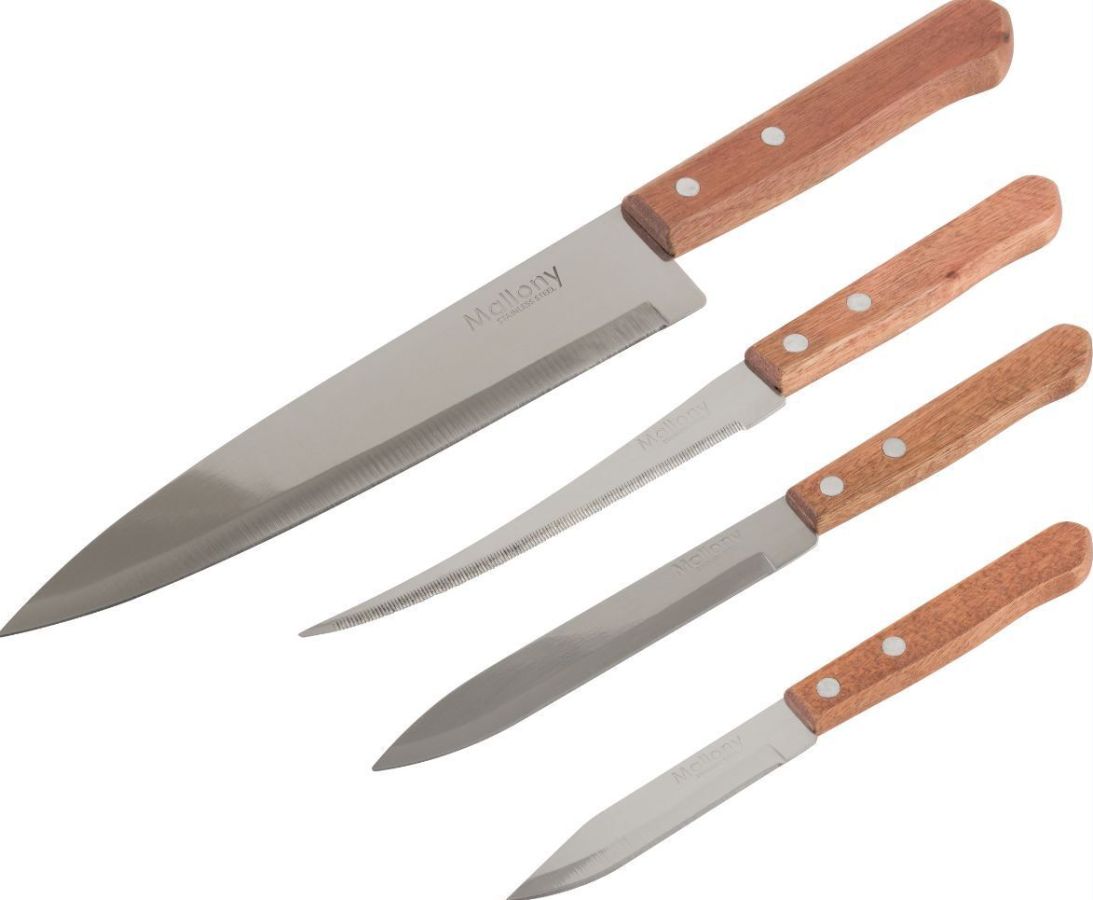 Набор ножей с деревянной рукояткой Состав набора: - нож поварской (длина лезвия 20 см, толщина стали 1,2 мм) - нож универсальный (длина лезвия 15 см, толщина стали 1,0 мм) - овощной (длина лезвия 12,5 см, толщина стали 1,0 мм) - овощной малый (длина лезвия 9 см, толщина стали 1,0 мм) Материал: нержавеющая сталь, дерево