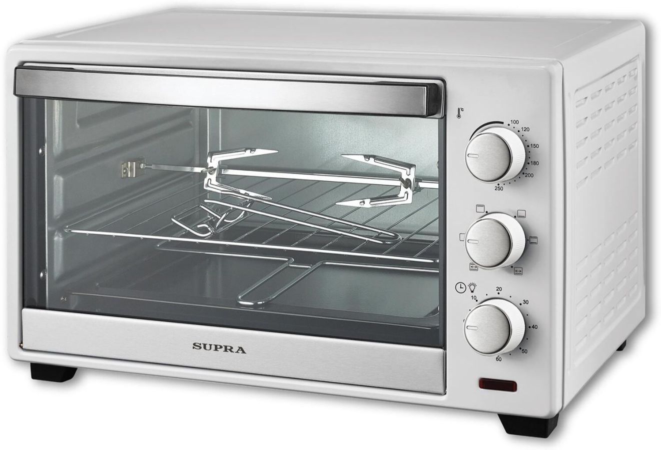 Электрическая печь с грилем, объем: 35 л, потребляемая мощность: 1850 В, механическое управление, гриль, электрический гриль, температура: 100-250°С, таймер отключения: до 60 минут, сигнал окончания приготовления, внутренняя подсветка, 6 режимов нагрева, индикация включения, комплектация: металлическая решетка, плоский противень, насадка для шашлыка/кебаба, ухват для противня, вертел, ухват для вертела