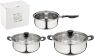 Набор посуды из 5 предметов PROMO: 2 кастрюли 1,25 л+2,2 л (с крышками)+ ковш 1,25 л (без крышки) Материал: нерж сталь, жаропрочное стекло, нейлон. Толщина стенок 0,3 мм, объемы: 1,25 л кастрюля, 2,2 л кастрюля, 1,25 л ковш. Размеры: 17,5*7,5 см/21,5*8,5см/17,5*7,5 см. (Диаметр*высота без крышки). Размеры с ручками: 30,7/24,3/28,4 см. Высоты крышек с ручками: 7,8/12,0/12,6 см. Дно однослойное. Подходит для всех типов плит. Не рекомендуется мыть в посудомоечной машине. Зеркальная полировка корпуса внутри и снаружи. Отметки литража. Ручки: нерж сталь+ нейлон. Крышка из жаропрочного стекла с отверстием для выпуска пара. Упаковка: стикер+белая коробка.
