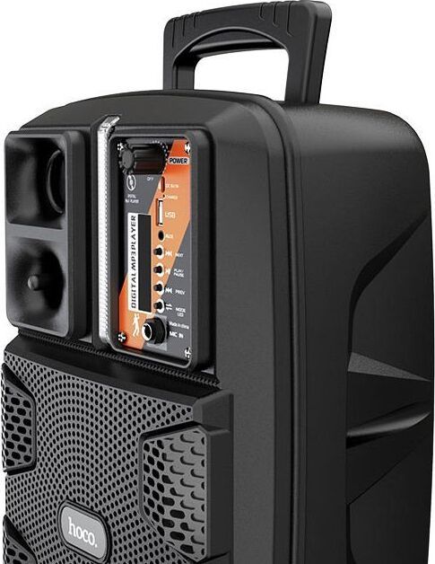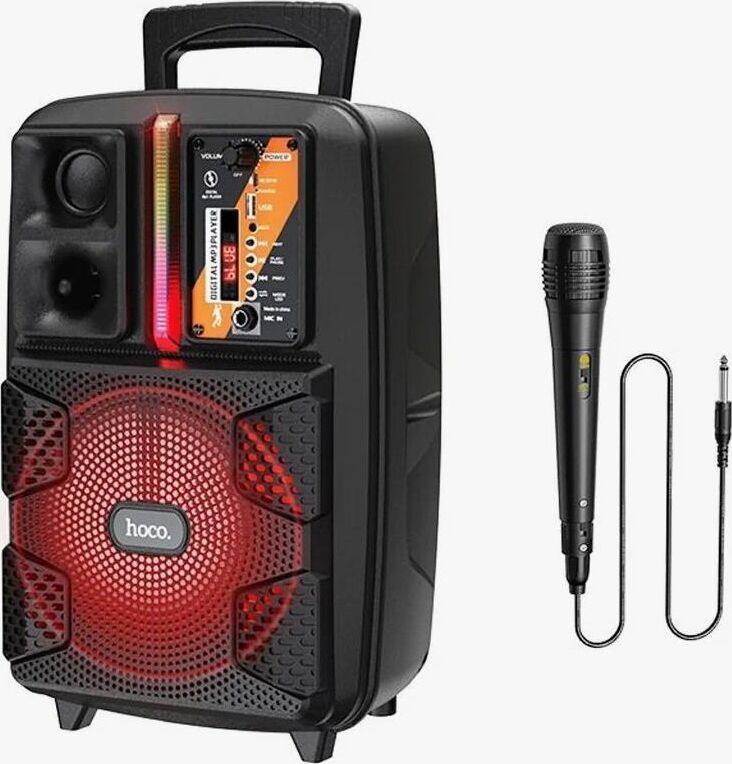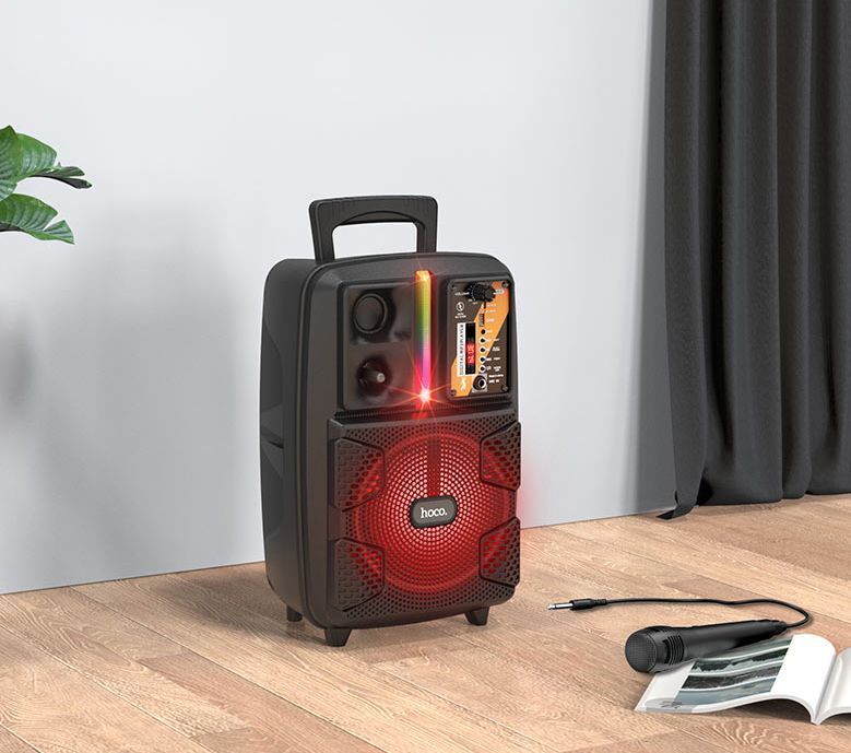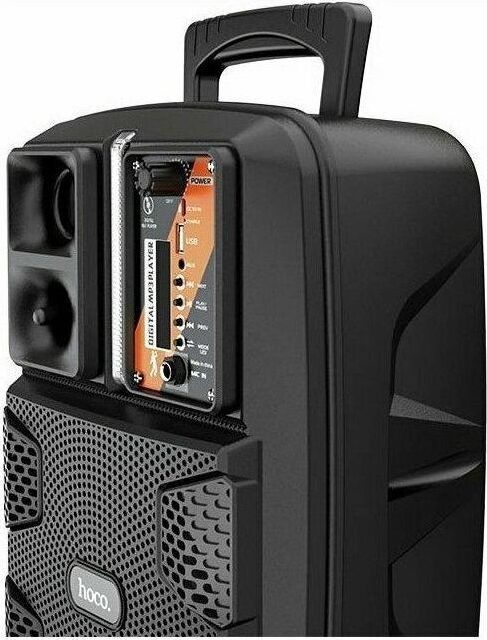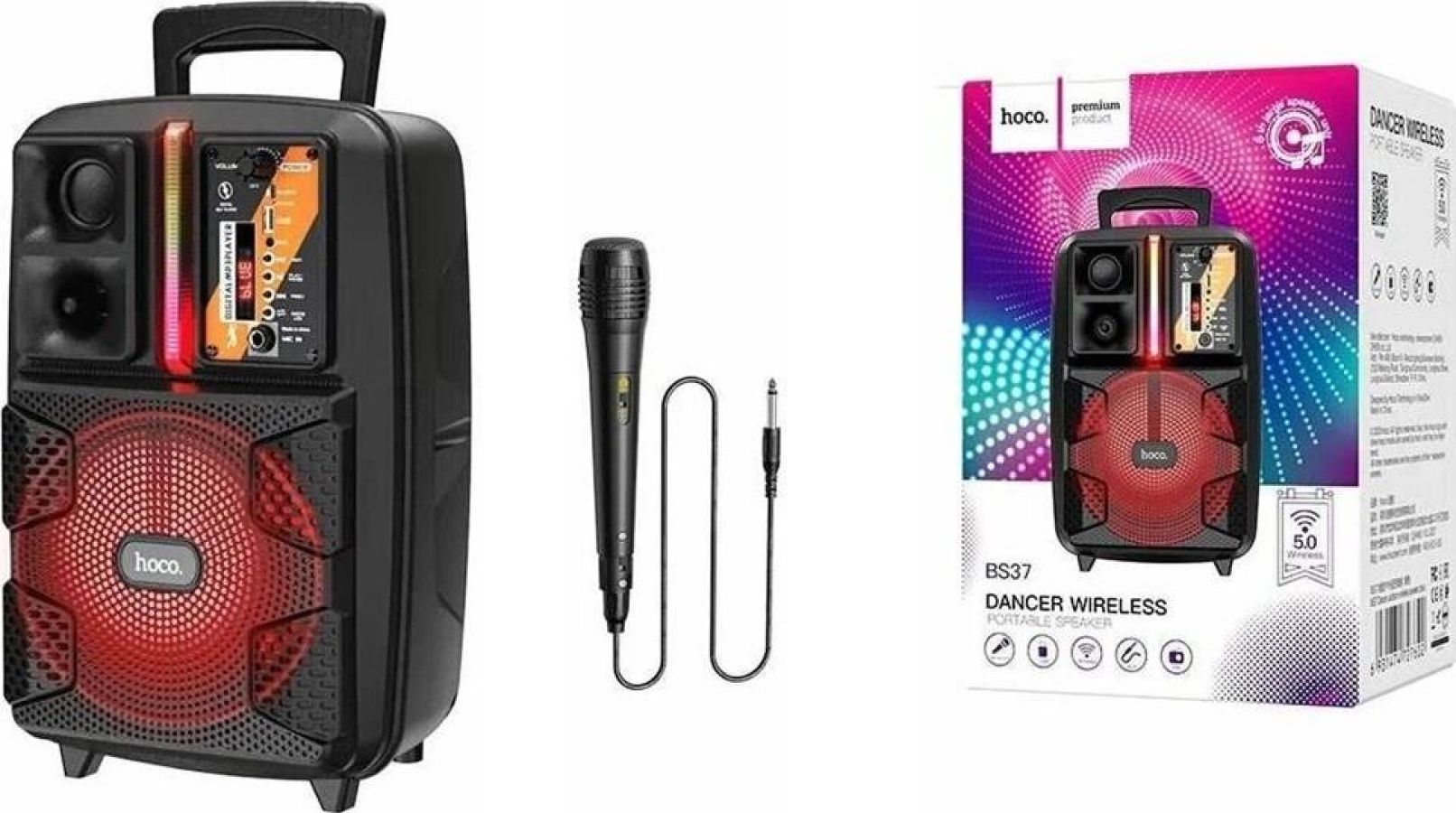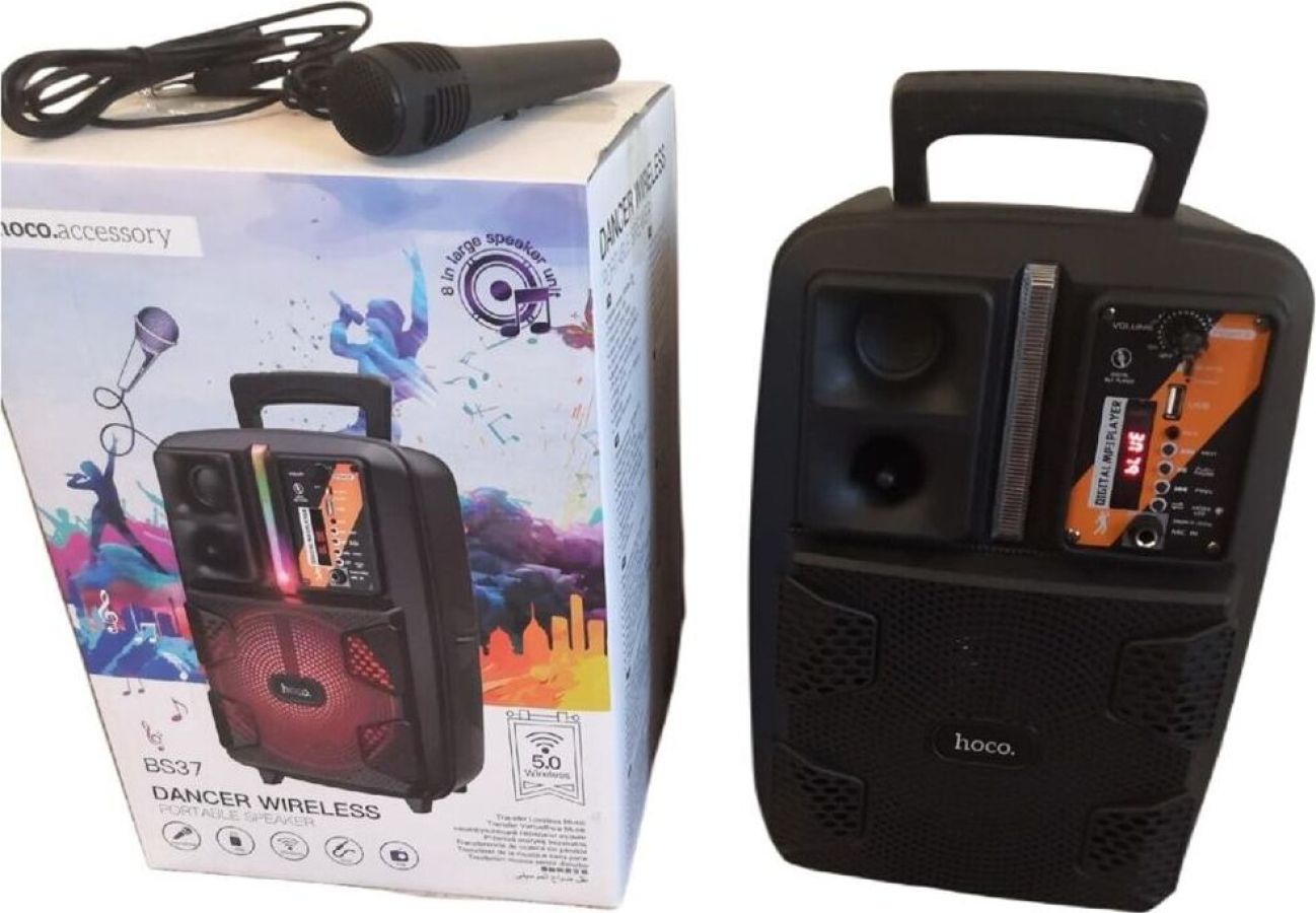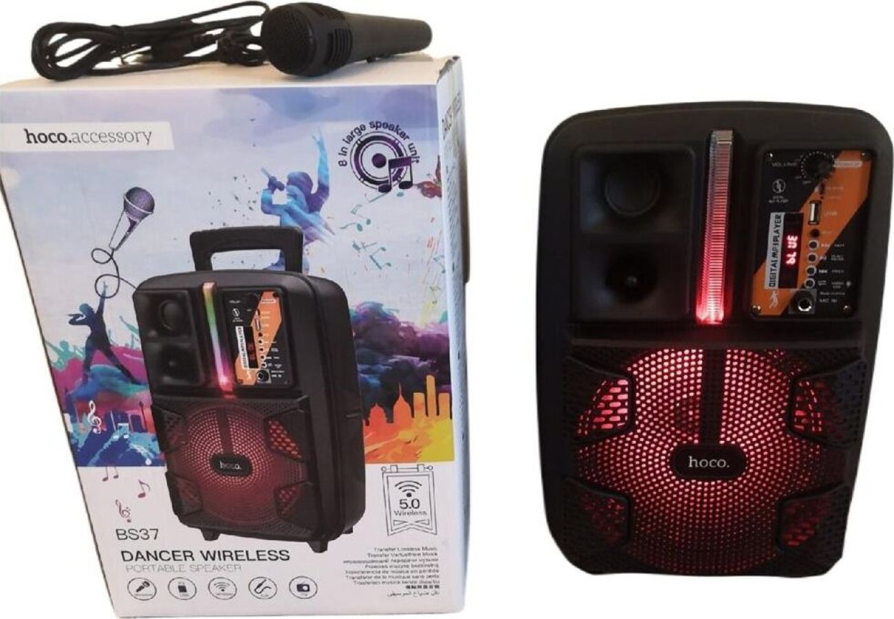 Спикер: 8 дюймов 2Ом 15W. Аккумулятор: 1800mAh, класс A, 18650. BT спецификация: BT V5.0 Zhongke Blue Flood. Функции: поддержка BT проигрывания / BT TWS соединения, FM, USB, AUX режимов проигрывания, вход для проводного микрофона. Поддержка переключения подсветки. Зарядное напряжение: DC 5V, время зарядки около 2.5 часов. В режиме музыки: около 3 часов (при громкости 80%). Размеры: 592*510*388 мм. Вес: 1.9 кг.