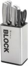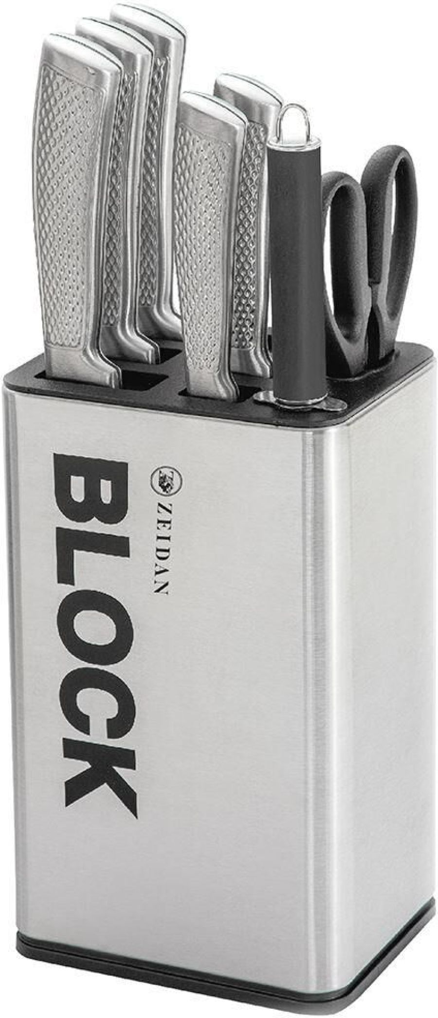 Набор ножей 8 предметов. Лезвие ножей из высококачественной нержавеющей стали: (нож поварской - 1,5mm/8", нож для хлеба - 1,5mm/8", нож-топорик -1,5mm/6,5", нож универсальный - 1,2mm/5", нож для овощей – 1,2mm/3,5", ножницы, мусат, ручки из нержавеющей стали с декором, подставка для ножей из нержавеющей стали.