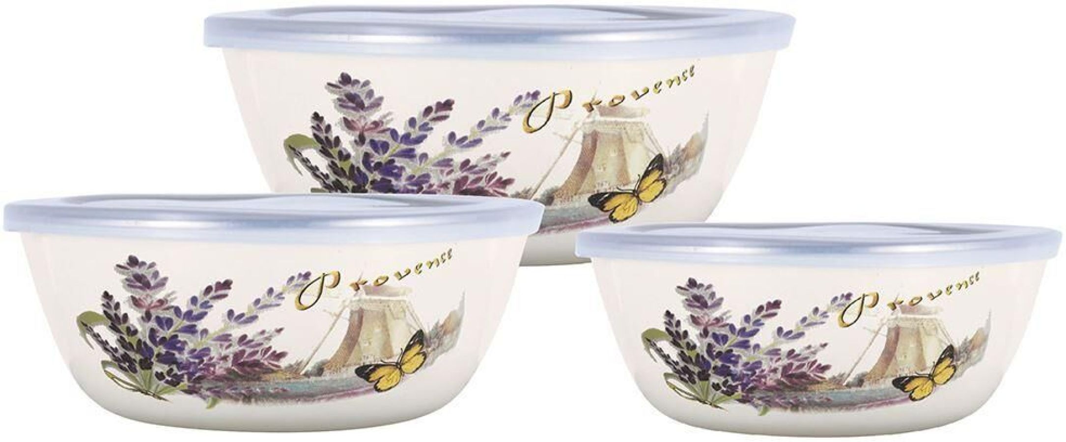 Набор мисок, 6 предм. (3 МИСКИ С КРЫШКАМИ: 0,85 Л (d16 см), 1,4Л (d18 см), 2,6 Л (d20 см) с внутренним эмалированным покрытием), эмалированная сталь, внешнее покрытие - эмаль с рисунком.