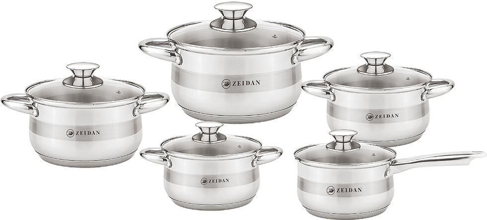 Набор посуды, 10 предм. (4 КАСТРЮЛИ С КРЫШКАМИ: 1.7 Л (d16 см), 2.5 Л (d18,0 см), 3.4 Л (d20 см ), 5.9 Л (d24 см ), СОТЕЙНИК С КРЫШКОЙ – 1,7 Л ( d16 см), нержавеющая сталь, комбинированная полировка снаружи, зеркальная полировка внутри, крышки - стекло, 5-ти СТЕПОВОЕ КАПСУЛИРОВАННОЕ ИНДУКЦИОННОЕ ДНО.