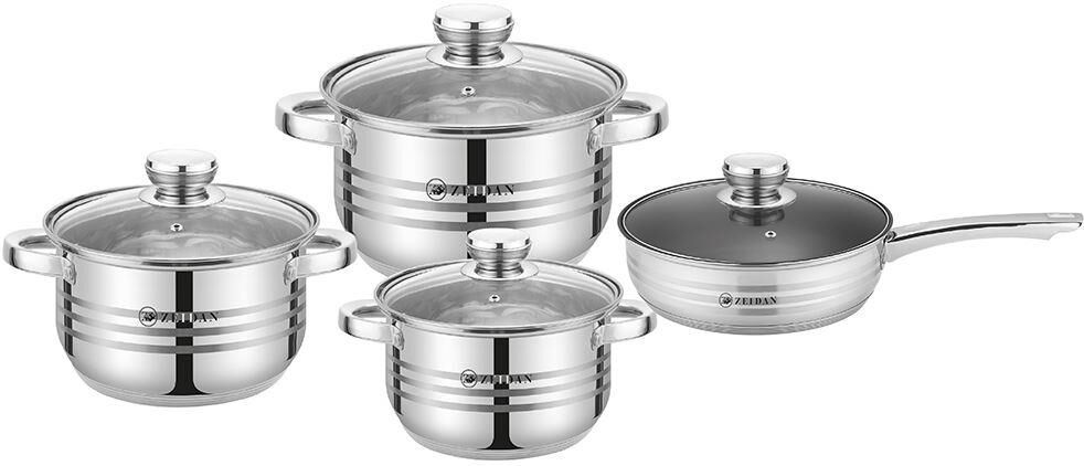 Набор посуды, 8 предм. ((3 КАСТРЮЛИ С КРЫШКАМИ: 2.0 Л (d16 см ), 3.0 Л (d18 см ), 4.0 Л (d20 см ), СКОВОРОДА С КРЫШКОЙ И АНТИПРИГАРНЫМ ПОКРЫТИЕМ – 3,0 Л (d26х5,5см) нержавеющая сталь, 5-ти СТЕПОВОЕ КАПСУЛИРОВАННОЕ ДНО, крышки - стекло, внутри - зеркальная полировка корпуса, снаружи -комбинированная полировка корпуса.