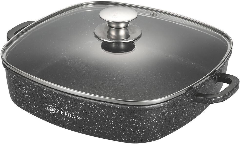 Жаровня со стеклянной крышкой – 4,5 л (28х28x7см), литой алюминий, крышка - стекло с силиконовым ободком и металлической ручкой, ИНДУКЦИОННОЕ ДНО, СИЛИКОНОВЫЕ НАКЛАДКИ, ВНУТРЕННЕЕ АНТИПРИГАРНОЕ ПОКРЫТИЕ «Queen Home», ВНЕШНЕЕ ЖАРОПРОЧНОЕ АНТИПРИГАРНОЕ ПОКРЫТИЕ.