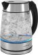 Объем -1,7 л. Мощность - 1850-2200 Вт. Тип нагревательного элемента - закрытая спираль. Индикация включения/уровня воды. Подсветка. Фильтр. Блокировка включения без воды. Отключение при снятии с подставки. Отсек для хранения шнура. Вращение на 360°. Материал корпуса - стекло. Длина сетевого шнура - 0.7 м. Габаритые размеры - 160х241х210 мм. Вес - 1.15 кг.