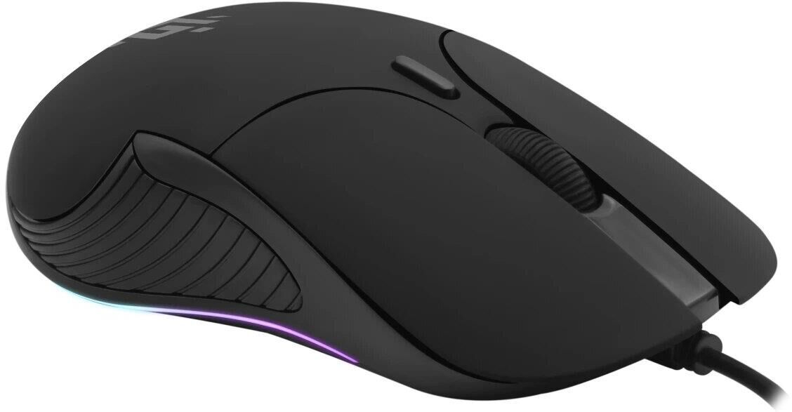 Проводная игровая мышь с четырьмя режимами разрешения и радужной подсветкой. Также мышь имеет прорезиненное колесо прокрутки, 2 дополнительные боковые кнопки и тефлоновые ножки.
