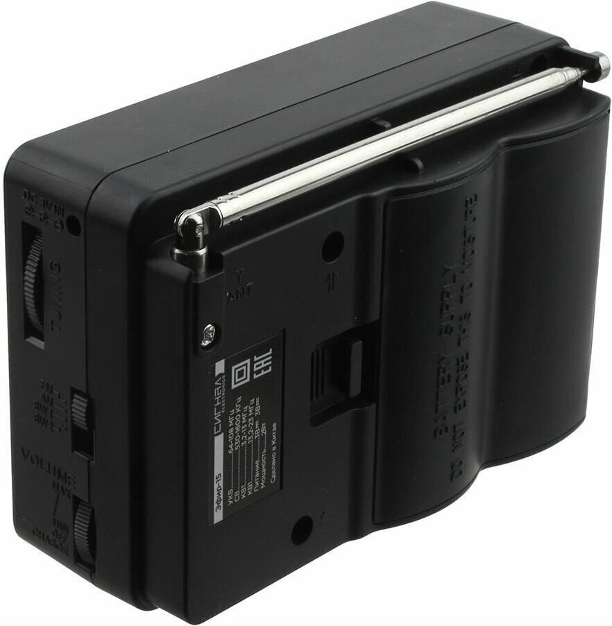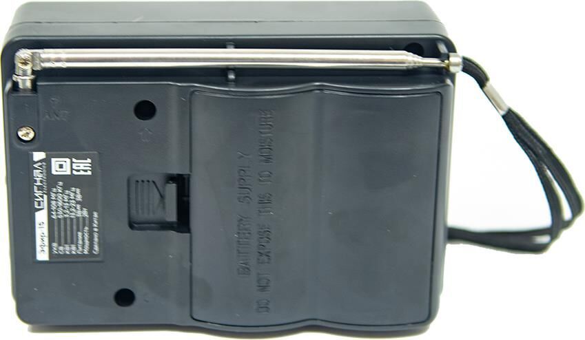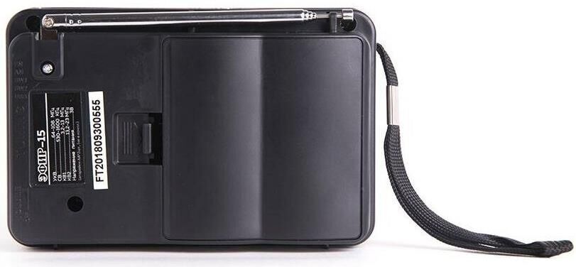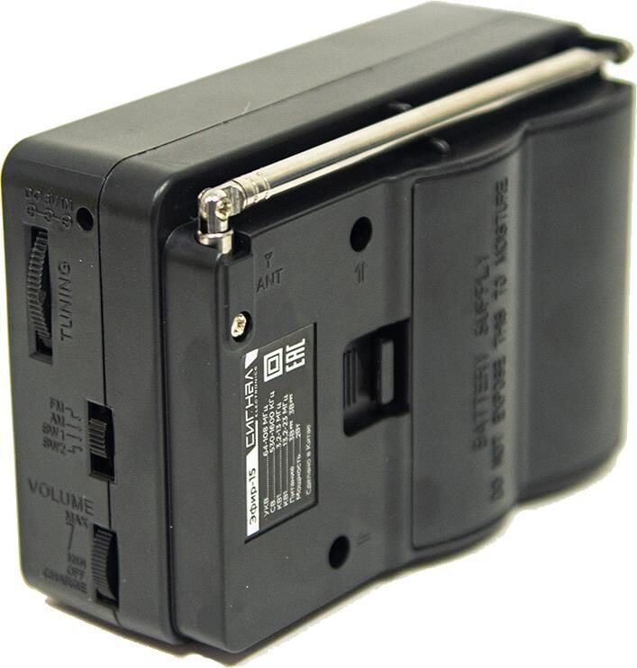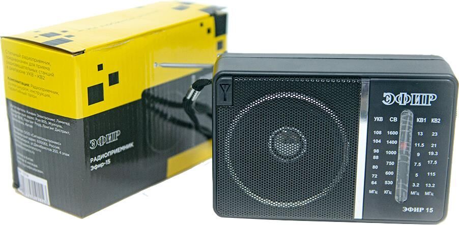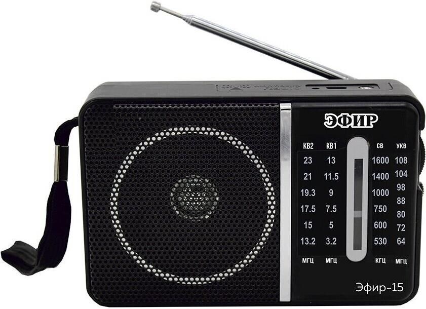 Эфир-15 имеет аналоговый тип тюнера, обеспечивает сигнал в диапазонах УКВ/СВ/КВ1-2 с частотой УКВ(64-108МГц) / СВ (530-1600КГц) / КВ1, КВ2 (3,2-23МГц) соответственно, наличие 1-го динамика с мощностью ?100mm/8?/8W. Радиоприемник работает от батареек R20, тип D и питания Mini USB, размер изделия составляет 135х60х90 мм, телескопическая антенна, разъем для наушников. В комплектацию радиоприемника входит: само устройство, шнурок, инструкция полностью на русском языке, цветная упаковка и гарантийный талон. Товар сертифицирован, гарантия 12 месяцев.