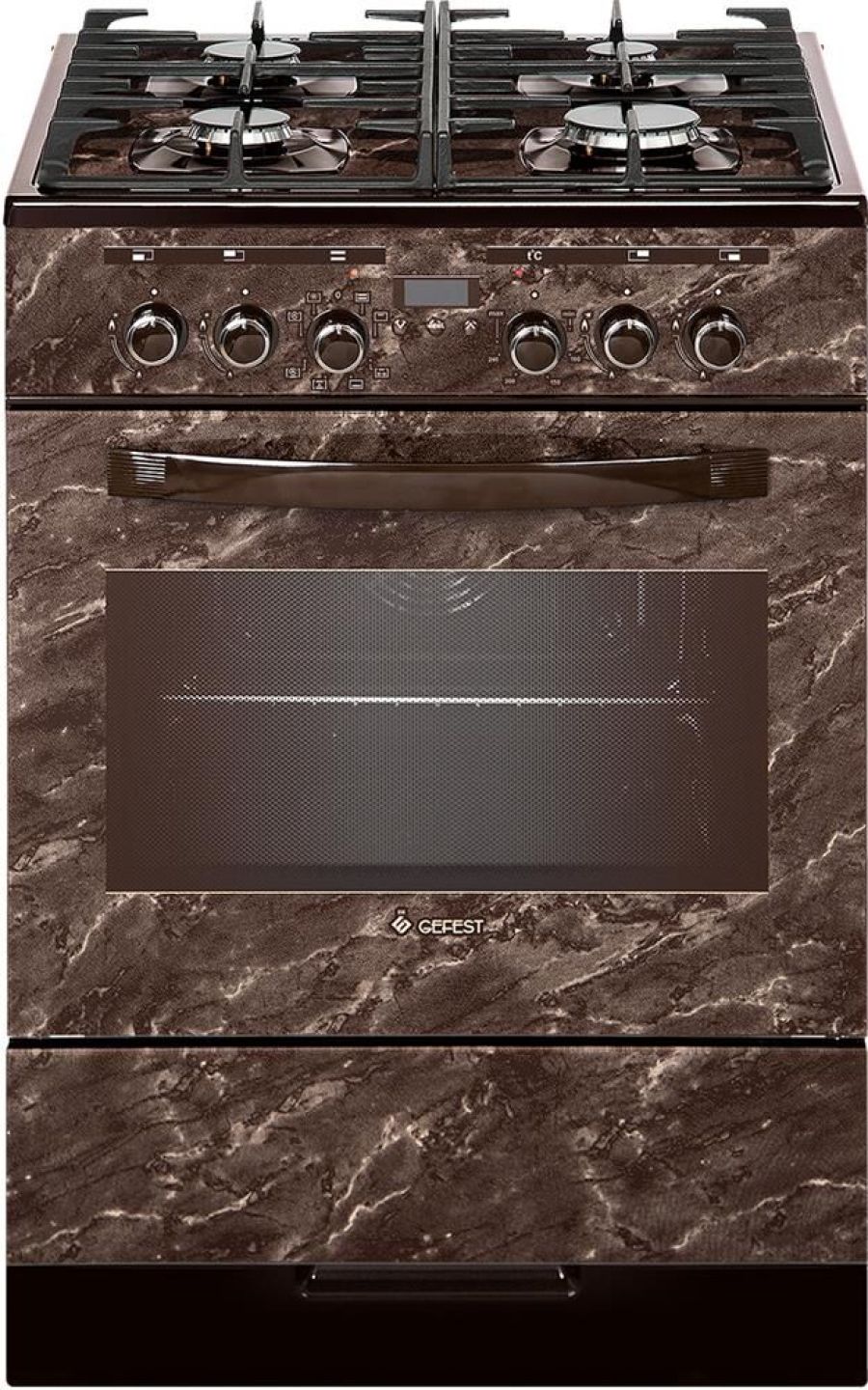 Газоэлектрическая плита. Цвет: коричневый с рисунком "мрамор". Варочная поверхность: стеклянная. Габаритные размеры ШхГхВ: 60х60х85 см. Объём духовки: 55 л. Фасад стеклянный. Варочная поверхность стеклянная, без крышки. Вертел с электроприводом. Выдвижной ящик для посуды и принадлежностей. Газ-контроль горелок стола. Гриль электрический. Ножки регулировочные. Подсветка духовки двойная. Съемные проволочные направляющие духовки. Таймер сенсорный многофункциональный. Терморегулятор (термостат). Ускоренный нагрев с конвекцией. Чугунные решетки горелок стола. Шашлычница. Электророзжиг горелок, встроенный в ручки.