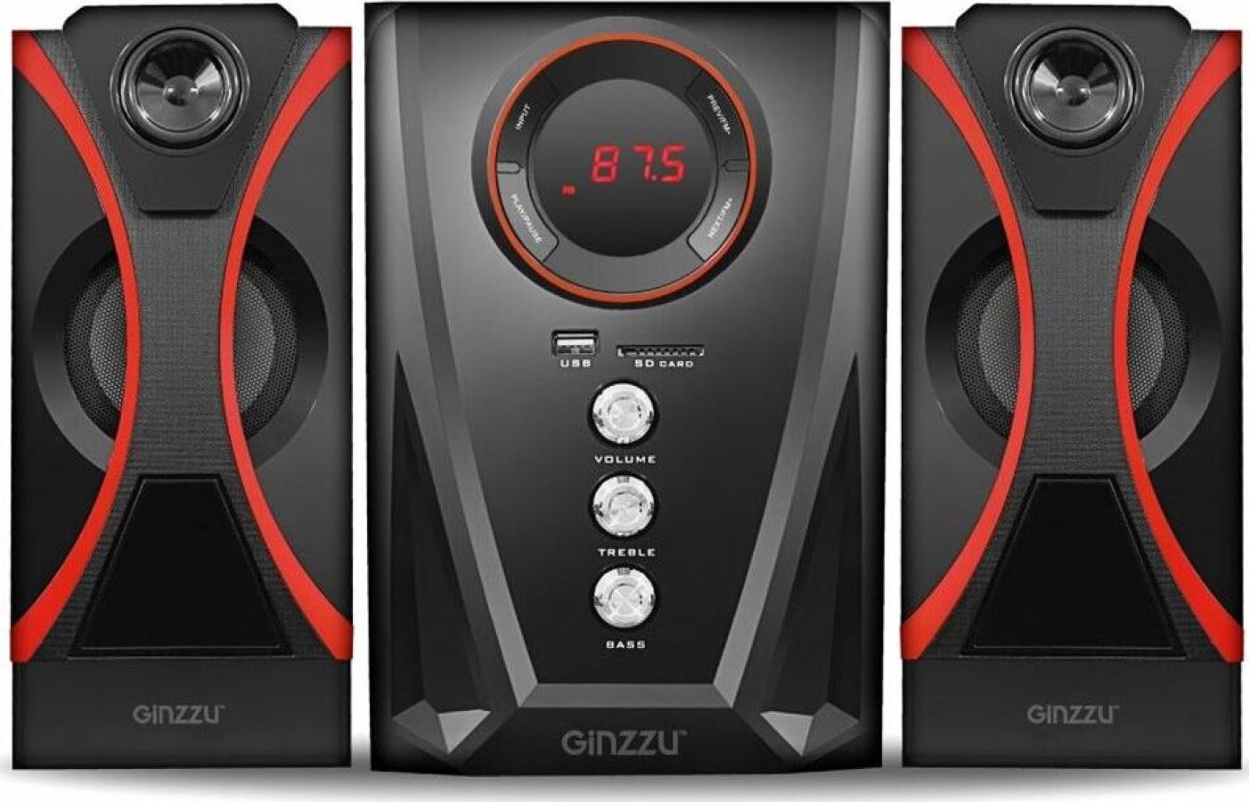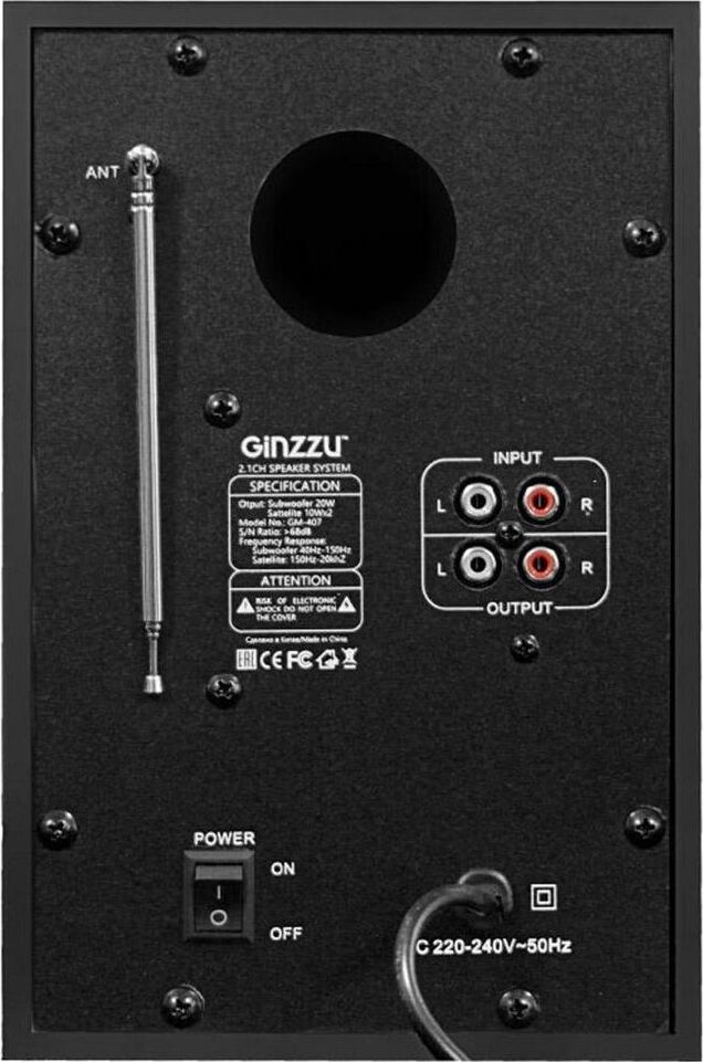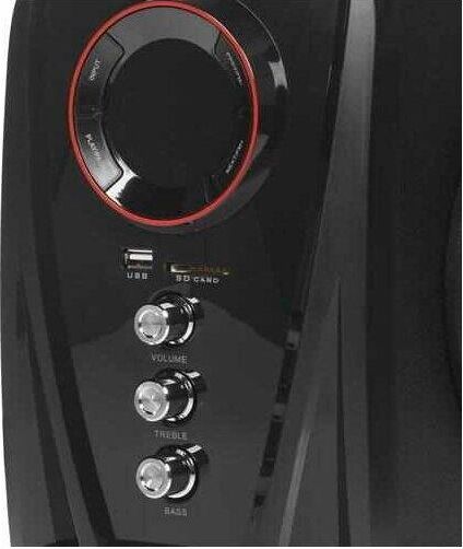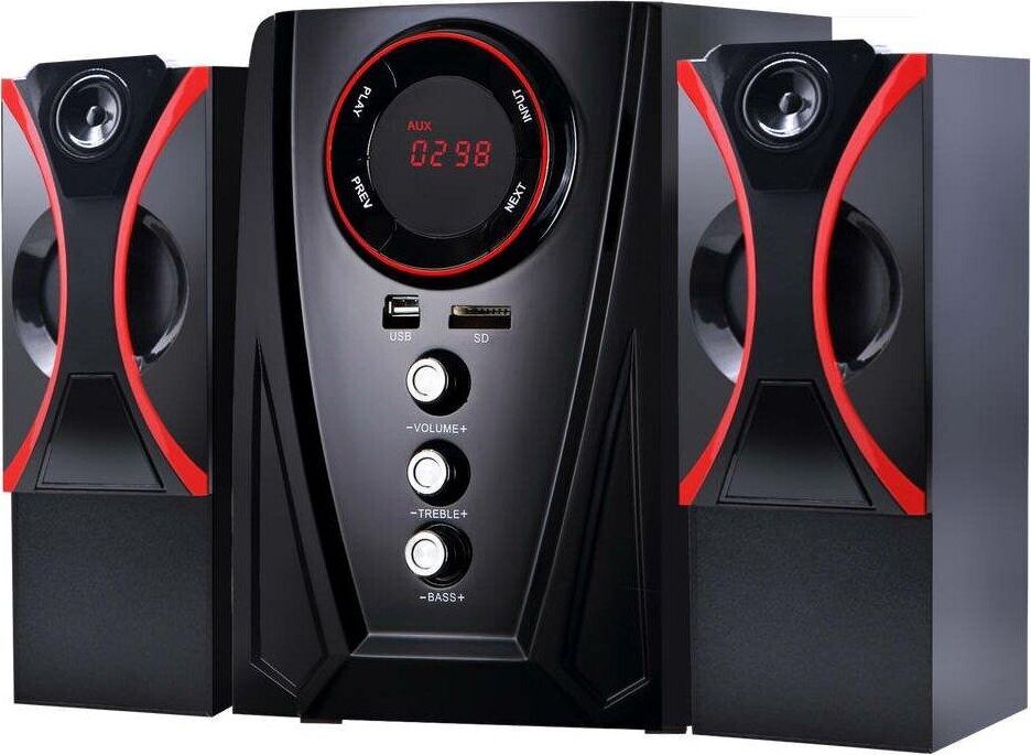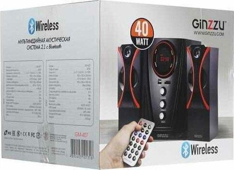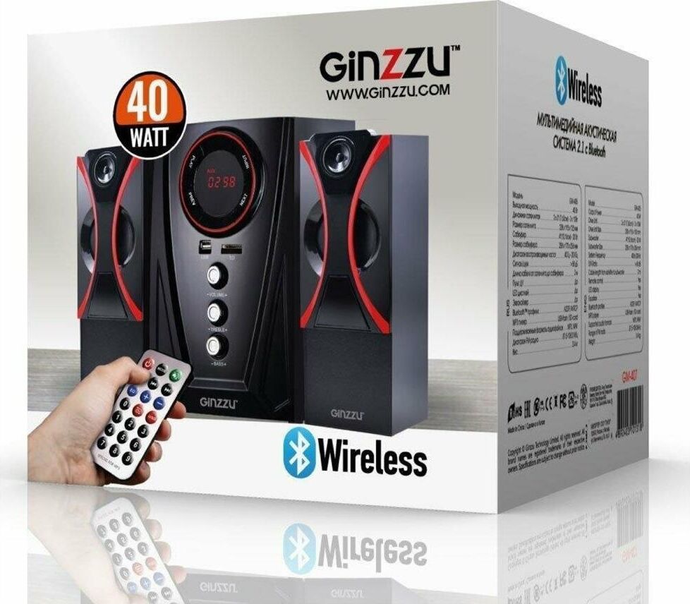 Мультимедийная акустическая система 2.1 с Bluetooth(v2.1), выходная мощность 40Вт (20Вт + 2х10Вт), аудиоплеер USB-flash, SD-card, FM-радио, пульт ДУ - 21 кнопка, стерео вход (2RCA), эквалайзер (обычный, джаз, рок, поп, классика), режимы MUTE, STANDBY, сабвуфер - дерево(MDF). Чувствительность - >68дБ. Диапазон частот - 40-20000Гц. Входные интерфейсы - USB 2.0, Стерео аудио (RCA). Выходные интерфейсы - Стерео аудио (RCA). Материал корпуса - МДФ, ABS пластик.