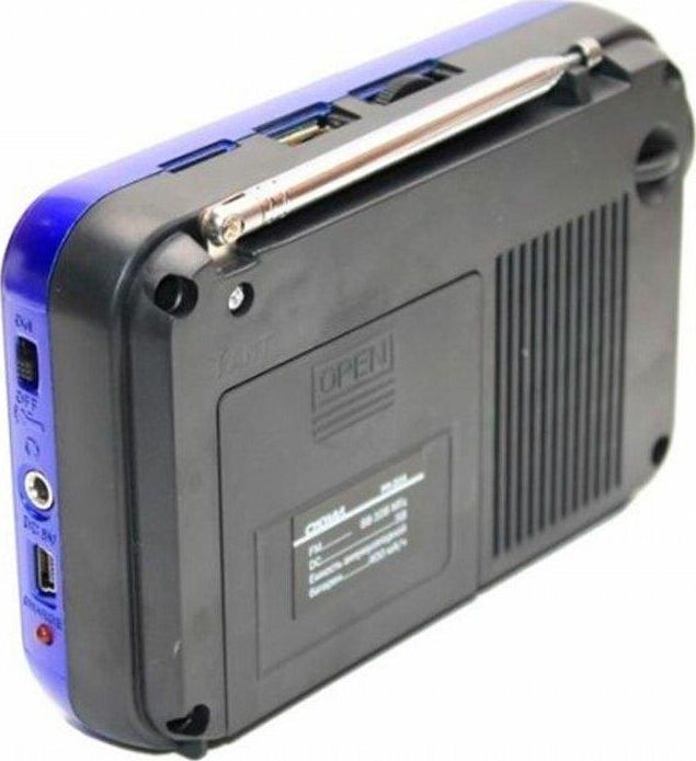 Цифровой тюнер, FM диапазон (FM-88-108МГц), автонастройка в FM диапазоне на 20 станций, 1 динамик (монозвучание) мощностью Ф57mm/4Ом/3W, питание 5В, батарейки АА*3шт (не в компл.), аккумулятор типа BL-5C, емкостью 400мА/ч, размер 135*35*85, дисплей, возможность воспроизведения с USB, microSD (TF), разъем для внешнего питания 5В, 1 встроенный фонарь 0,5Вт, телескопическая антенна, разъем под наушники, ручка для переноски.