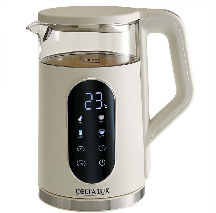 Параметры Объем 1,7 л Номинальная потребляемая мощность 2200 Вт Описание Чайник электрический предназначен для нагрева воды в бытовых и аналогичных условиях Корпус из термостойкого стекла и пластика Цвет: белый Закрытый нагревательный элемент из нержавеющей стали Вращение корпуса на 360° Сенсорное управление LCD-дисплей Шкала уровня воды внутри корпуса и отметка максимального уровня воды снаружи Отсек для хранения электрошнура Звуковая система оповещения 5 автоматических режимов нагрева воды: 40°C (детское питание), 70°C (белый чай), 80°C (зеленый чай), 90°C (кофе), 100°C (кипячение) Возможность ручной настройки температуры с шагом 5°C Функция поддержания температуры Функция памяти Автоматическое отключение при закипании Блокировка включения без воды Упаковка: цветная коробка
