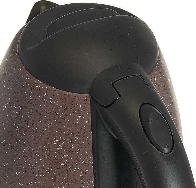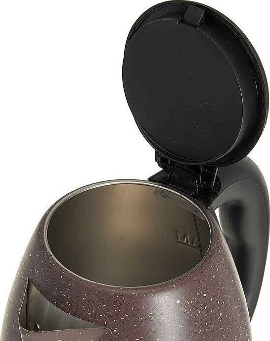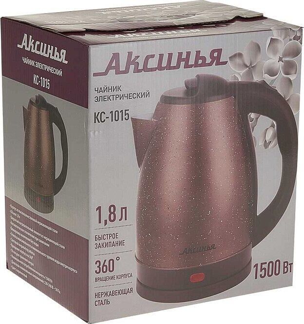 Параметры Объем 1,8 л Номинальная потребляемая мощность 1500 Вт Описание Чайник электрический предназначен для нагрева воды в бытовых и аналогичных условиях Корпус из высококачественной нержавеющей стали с цветным декоративным покрытием Цвет покрытия: коричневый Вращение корпуса на 360° Закрытый нагревательный элемент из нержавеющей стали Световой индикатор работы Отметка максимального и минимального уровня воды внутри корпуса Отсек для хранения шнура питания Быстрое закипание Автоматическое отключение при закипании Блокировка включения без воды Упаковка: цветная коробка