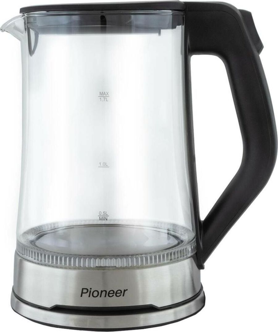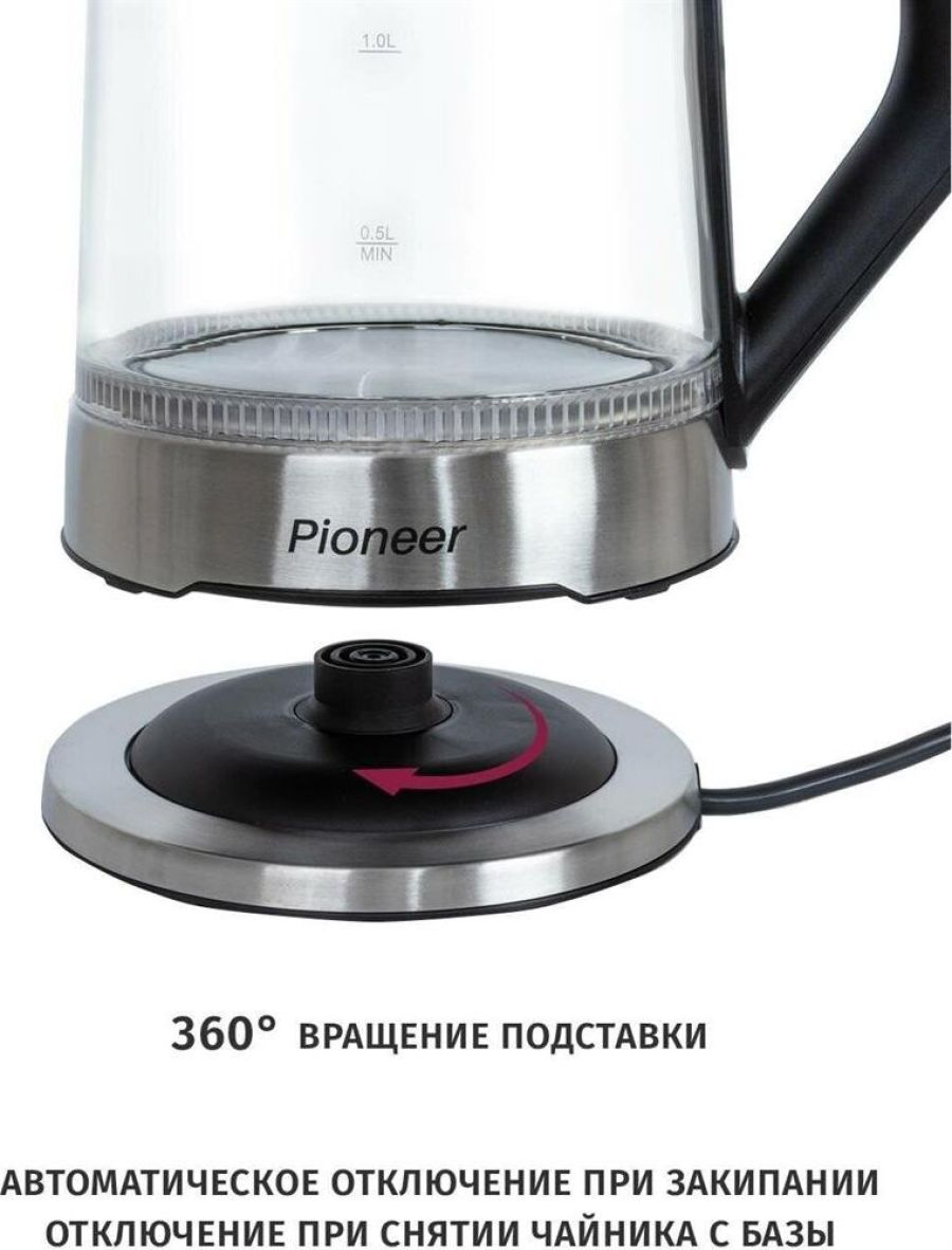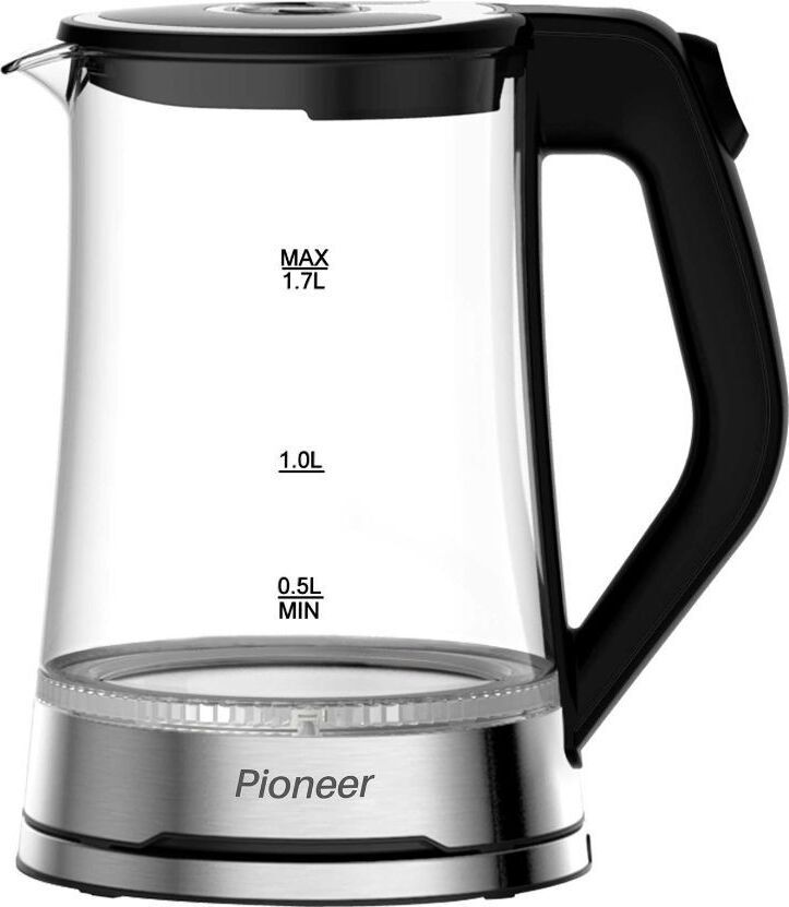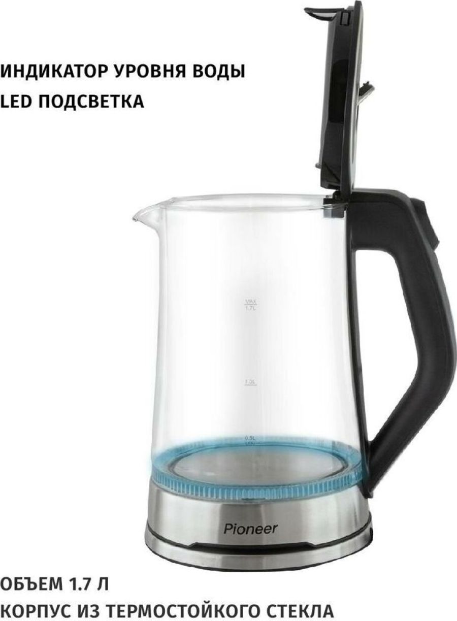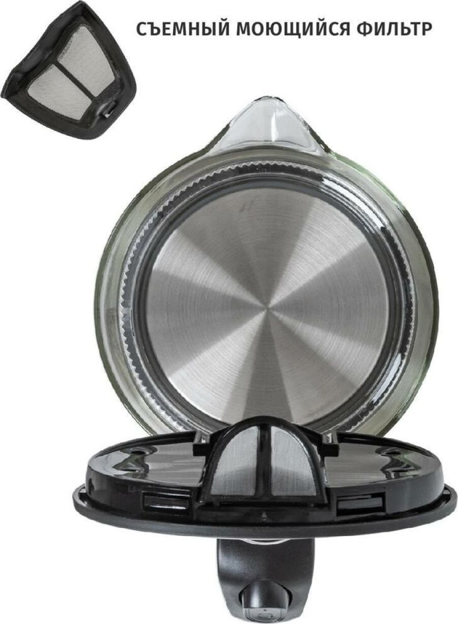 Максимальный объем, л.: 1,7 Тип нагревательного элемента: диск Подставка с вращением на 360 : есть Фильтр: съемный моющийся Отключение при закипании: есть Отключение при отсутствии воды: есть Индикатор уровня воды: есть Подсветка: есть Комплектация: чайник, гарантийный талон, инструкция на русском языке Материал корпуса: термостойкое стекло Цвет: черный Максимальная потребляемая мощность, Вт.: 2200 Электропитание, в., Гц.: 220-240, 50