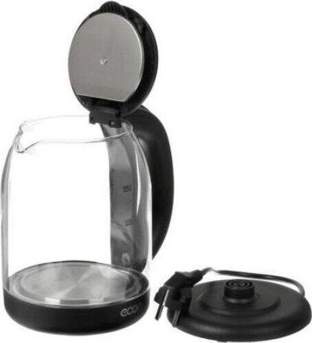 Максимальный объем, л. 1,8. Способ открывания крышки вручную. Подставка с вращением на 360? есть. Хранение сетевого шнура в подставке есть. Отключение при закипании есть. Отключение при отсутствии воды есть. Индикатор уровня воды есть. Индикатор включения есть. Подсветка есть. Материал корпуса стекло. Цвет черный. Потребляемая мощность, Вт. 1500. Электропитание, В., Гц. 220-240, 50.