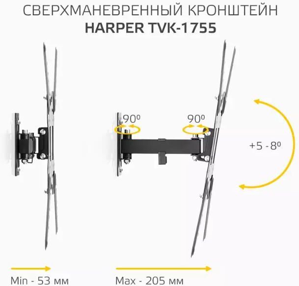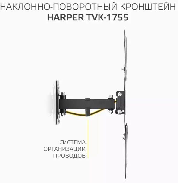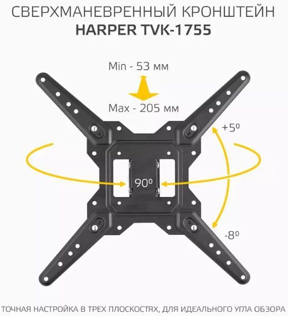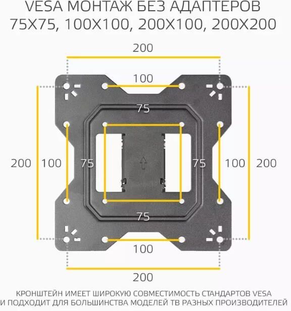 Назначение: для LCD- и LED-телевизоров. Совместимость с диагональю ТВ: 23, 24, 32, 42, 43, 50, 55. Тип кронштейна: наклонно-поворотный. Совместимость: поддерживает ТВ с диагональю 23-55. Максимальный вес ТВ: 30 кг. Крепление стандарта Vesa: до 400х400. Типы VESA: 100x100, 100x200, 200x100, 200x200, 300x200, 300x300, 400x200, 400x300, 400x400. Угол наклона: -8°+5°. Масштабирование по горизонтали: да. Масштабирование по вертикали: да. Материал корпуса: сталь, пластик. Минимальное расстояние от стены: 53 мм. Максимальное расстояние от стены: 205 мм. Комплектация: Кронштейн, настенные профили, универсальные опоры, крепёжные детали, инструкция, гарантийный талон. Цвет: черный. Размеры (ШхВхГ): 430х430x60 мм. Вес: 1.4 кг.