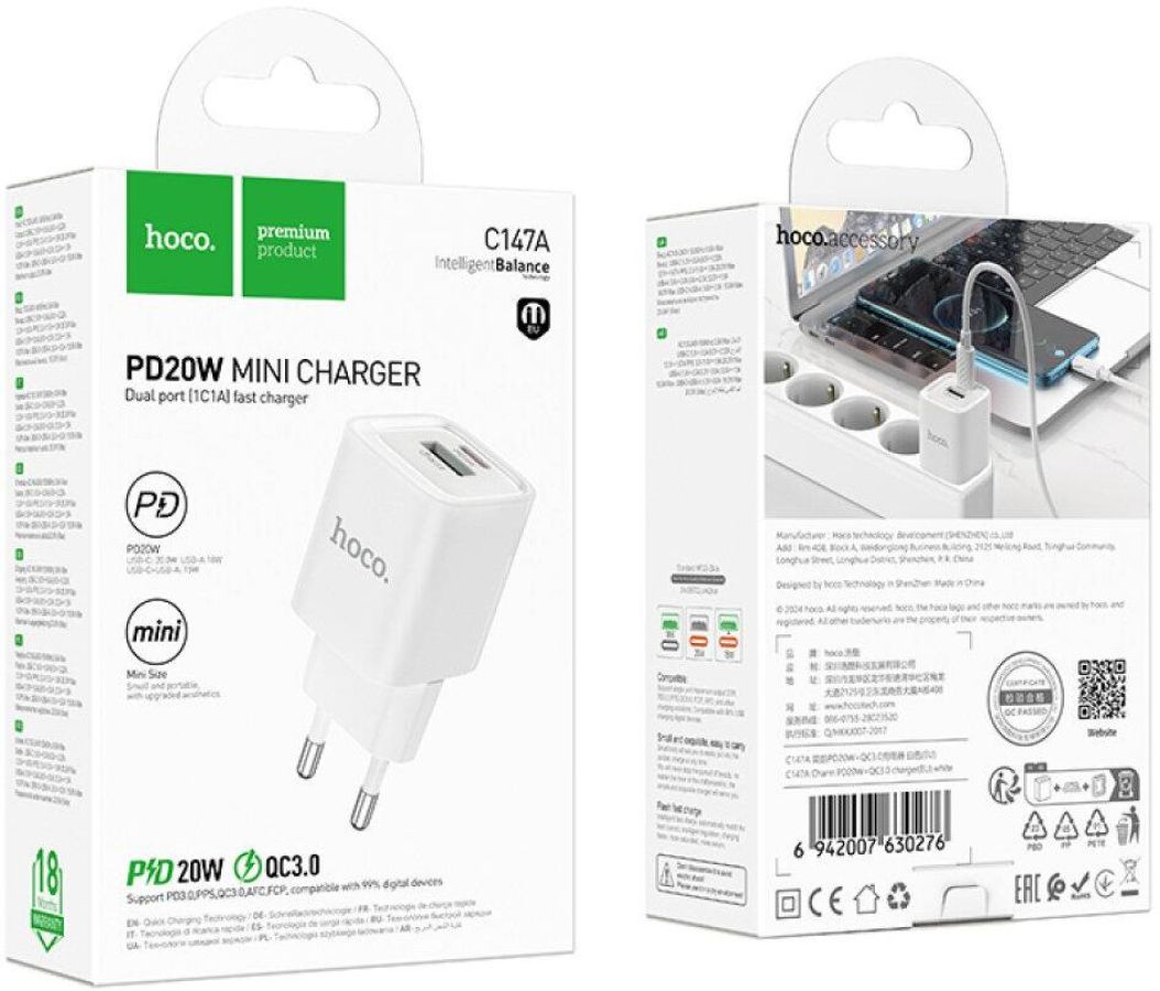 Универсальное сетевое зарядное устройство для электронной техники с двумя встроенными портами для быстрой зарядки: USB-A + Type-C. Зарядное устройство подходит для быстрой и безопасной зарядки одновременно двух устройств. Адаптер легко можно взять с собой в автомобильное путешествие, компактный и практичный, он не займет много места и быстро зарядит ваши мобильные устройства.