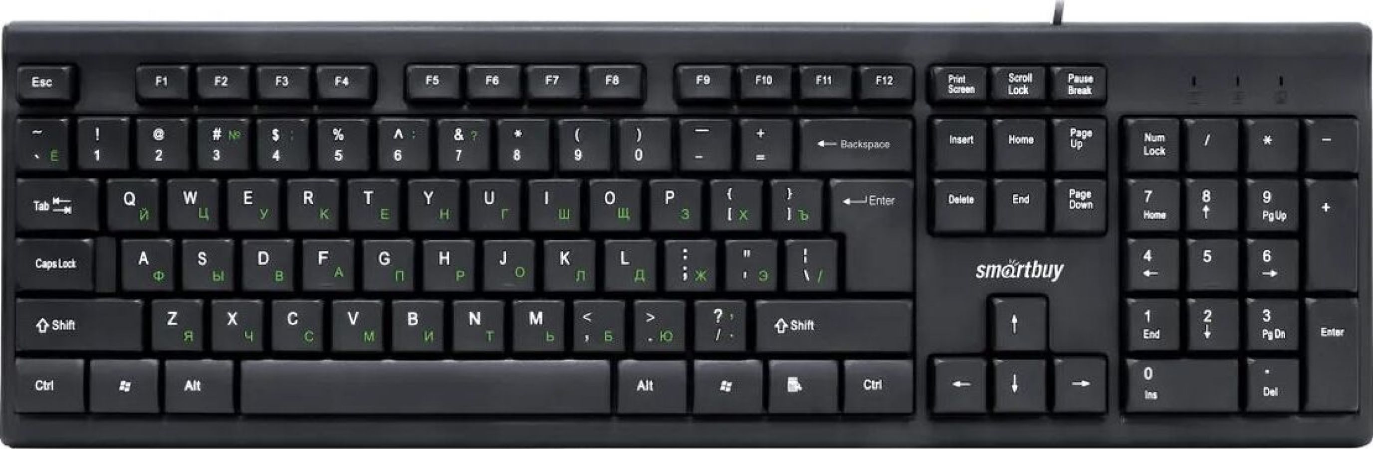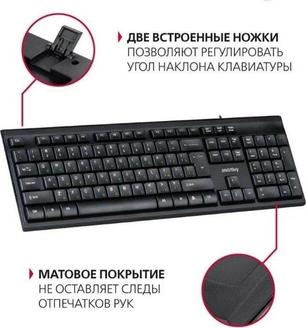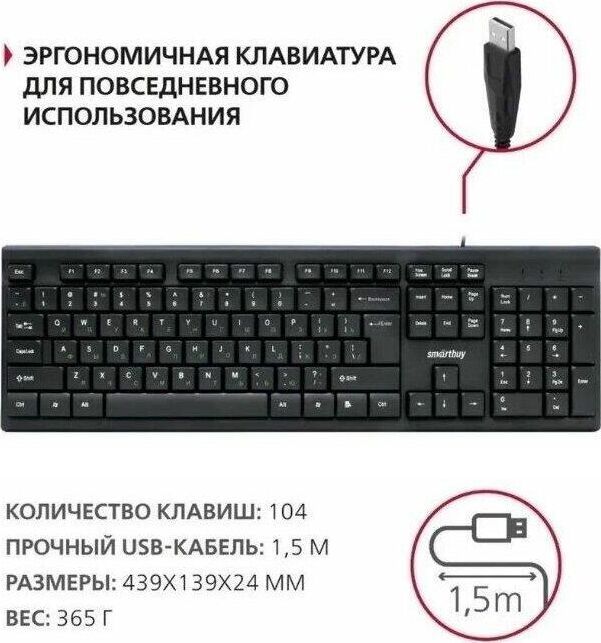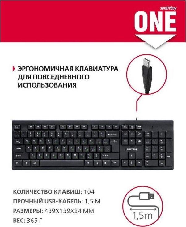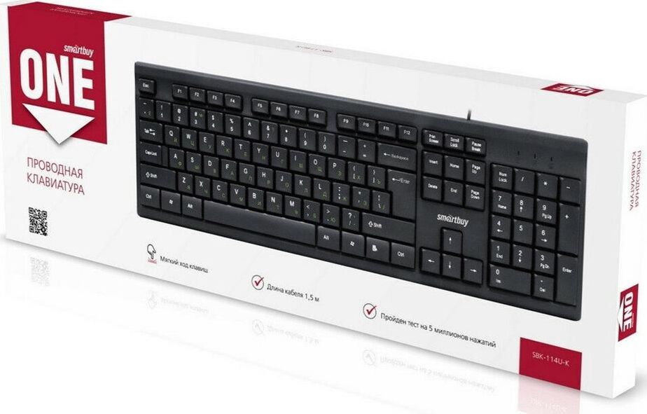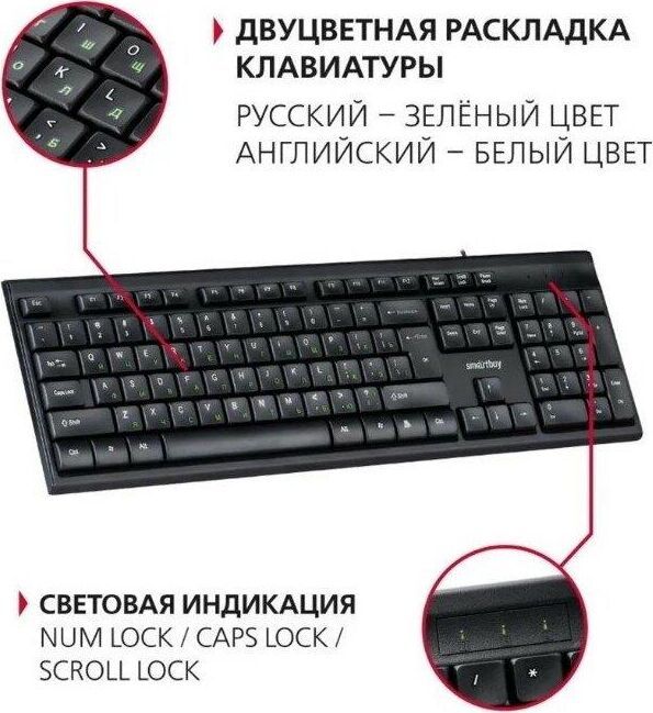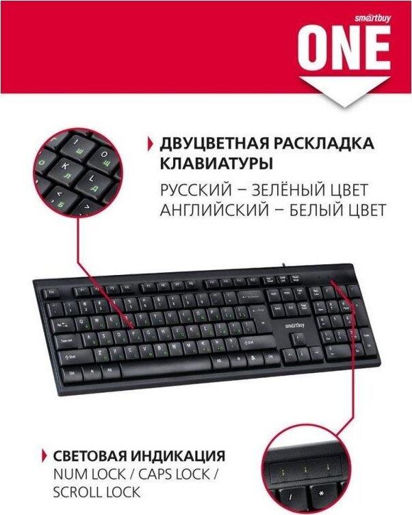 Комплектация: Клавиатура проводная SMARBUY ONE 114 USB черный , Подсветка: подсветка клавиш , Раскладка клавиатуры: русская
