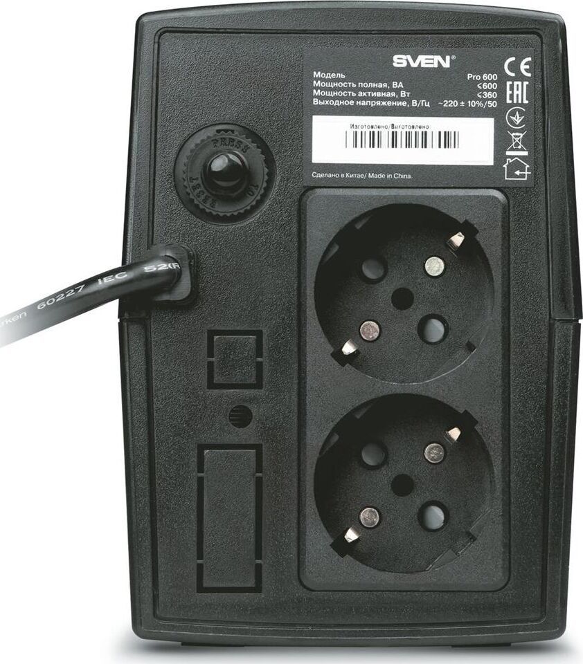 Тип ИБП линейно-интерактивный, Тип нагрузки: компьютер, монитор, Мощность полная, ВА: 600, Мощность активная, Вт: 360, Максимальная нагрузка, Вт 360, Уровень входного напряжения, В: ~165 – 275, Уровень выходного напряжения, В: ~220 ± 10 %, Форма выходного напряжения: апроксимированная синусоида, AVR (авторегулятор напряжения), Входная частота, Гц: 50, Рабочая частота, Гц: 50 ± 1 % (в режиме работы от батареи), Входная вилка: 1 х СЕЕ7/4, Выходные розетки, шт: 2 х СЕЕ7/4, Защита: от короткого замыкания, импульсных и высокочастотных помех; тепловая защита трансформатора, Типовое время переключения, мс: 10.