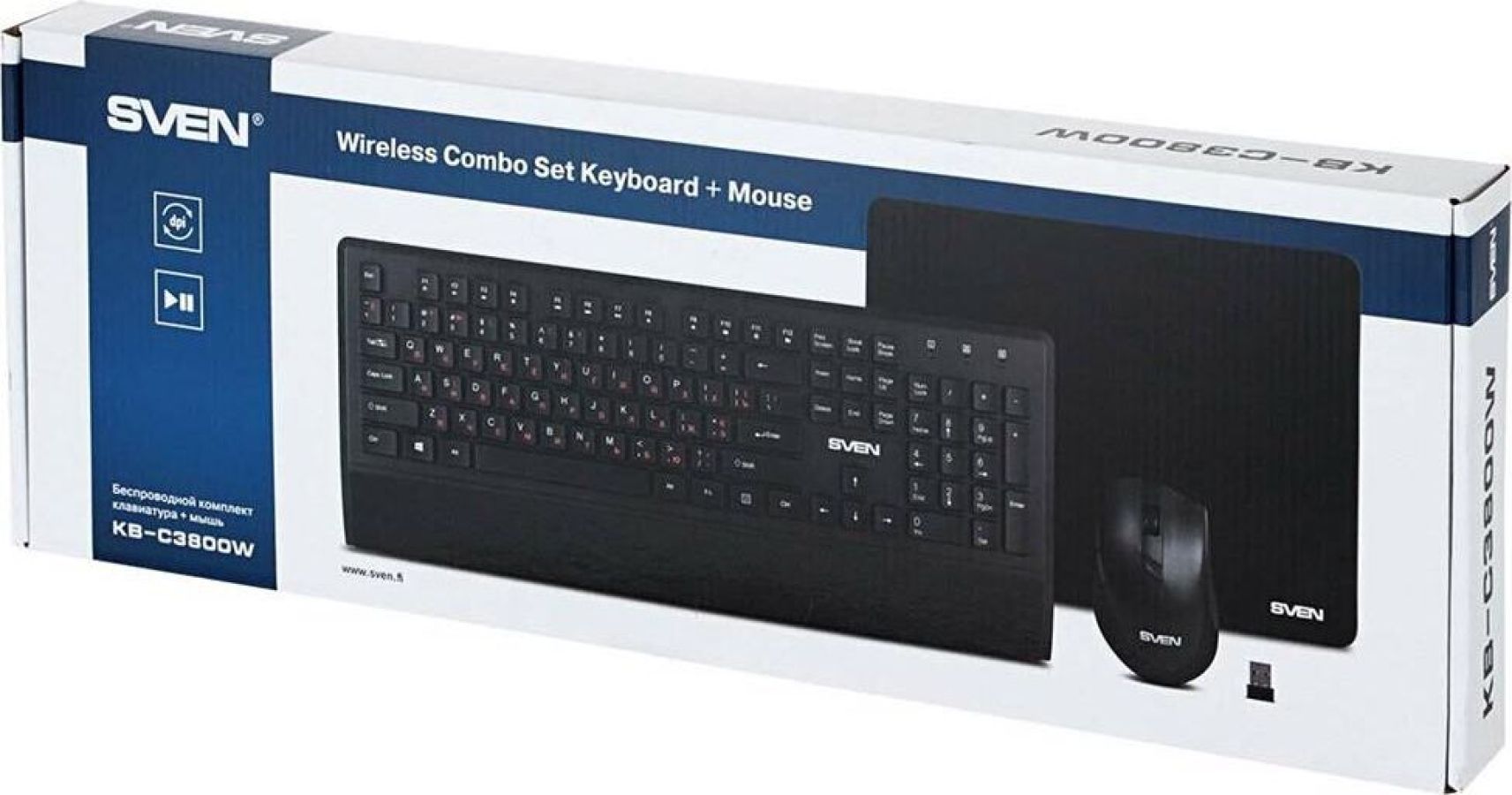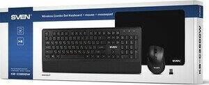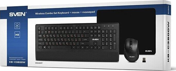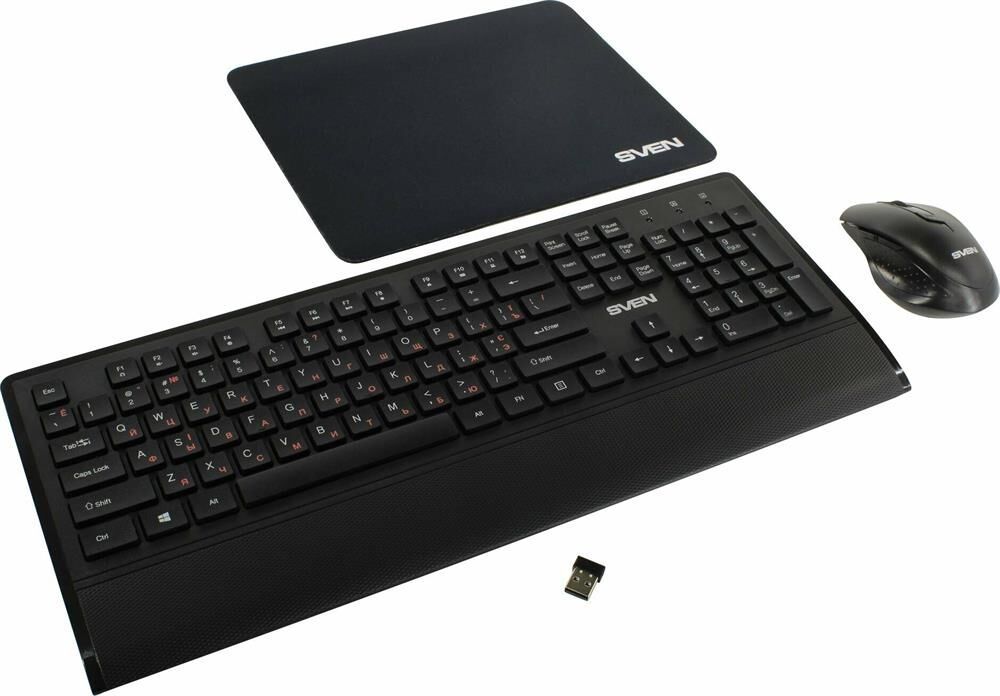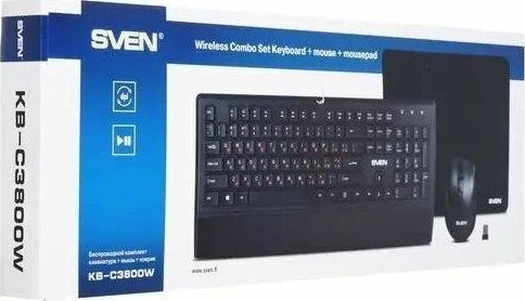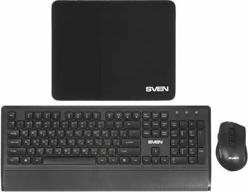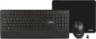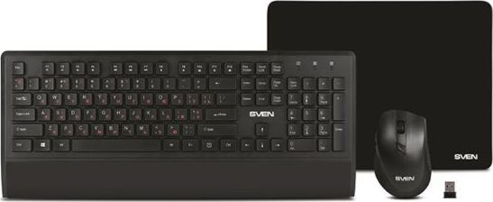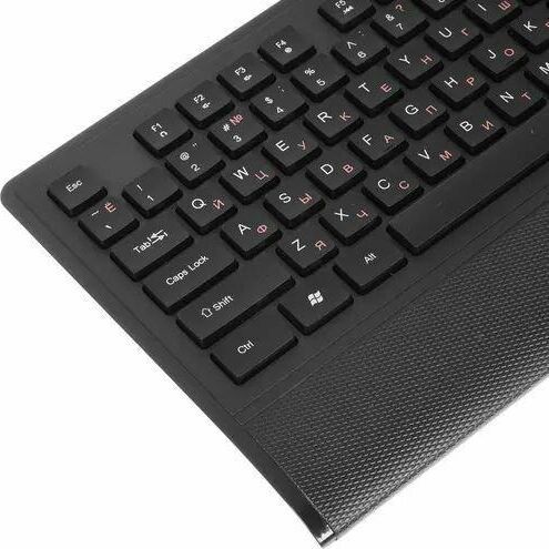 Набор беспроводной (клавиатур+мышь+коврик), интерфейс USB; клавиатура - количество клавиш 104, быстрого доступа - 12 (Fn), классическая раскладка, влагоустойчивая; мышь - оптическая, количество кнопок - 5, колесо прокрутки, изменяемое разрешение - 800/1200/1600 dpi; коврик - материал - тканевая основа+вспененная резина, габаритные размеры - 300х230 мм.