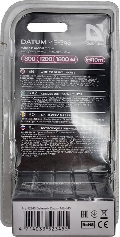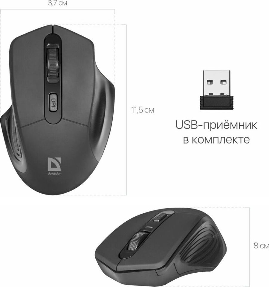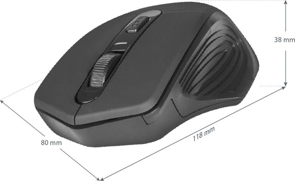 Мышь беспроводная оптическая, интерфейс USB, 5 клавиш+ колесо-кнопка, разрешение сенсора 800/1200/1600 dpi, цвет: черный