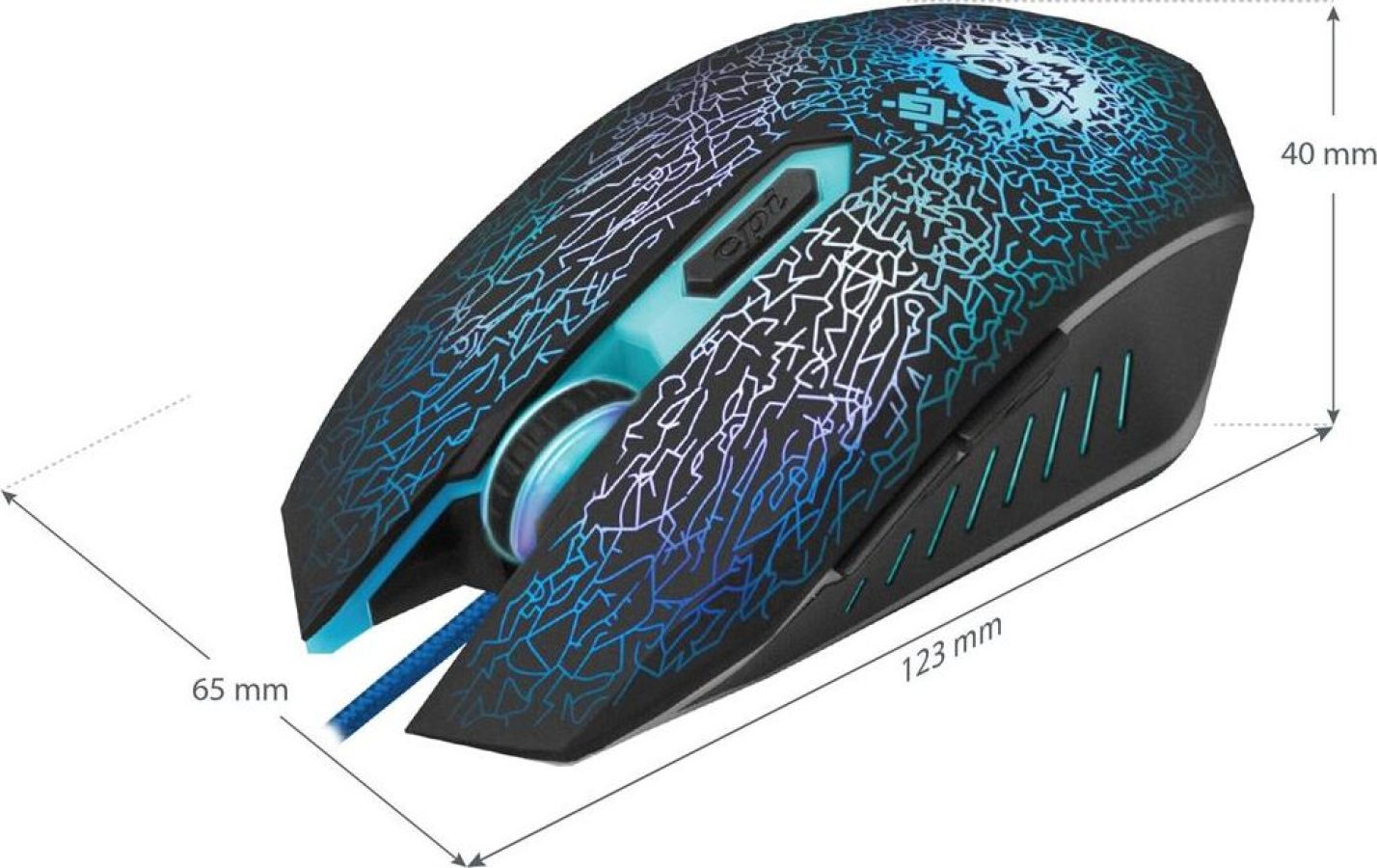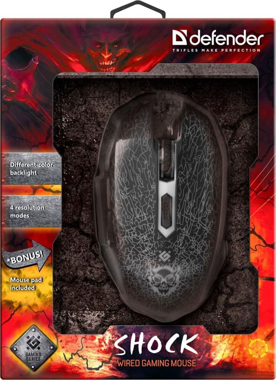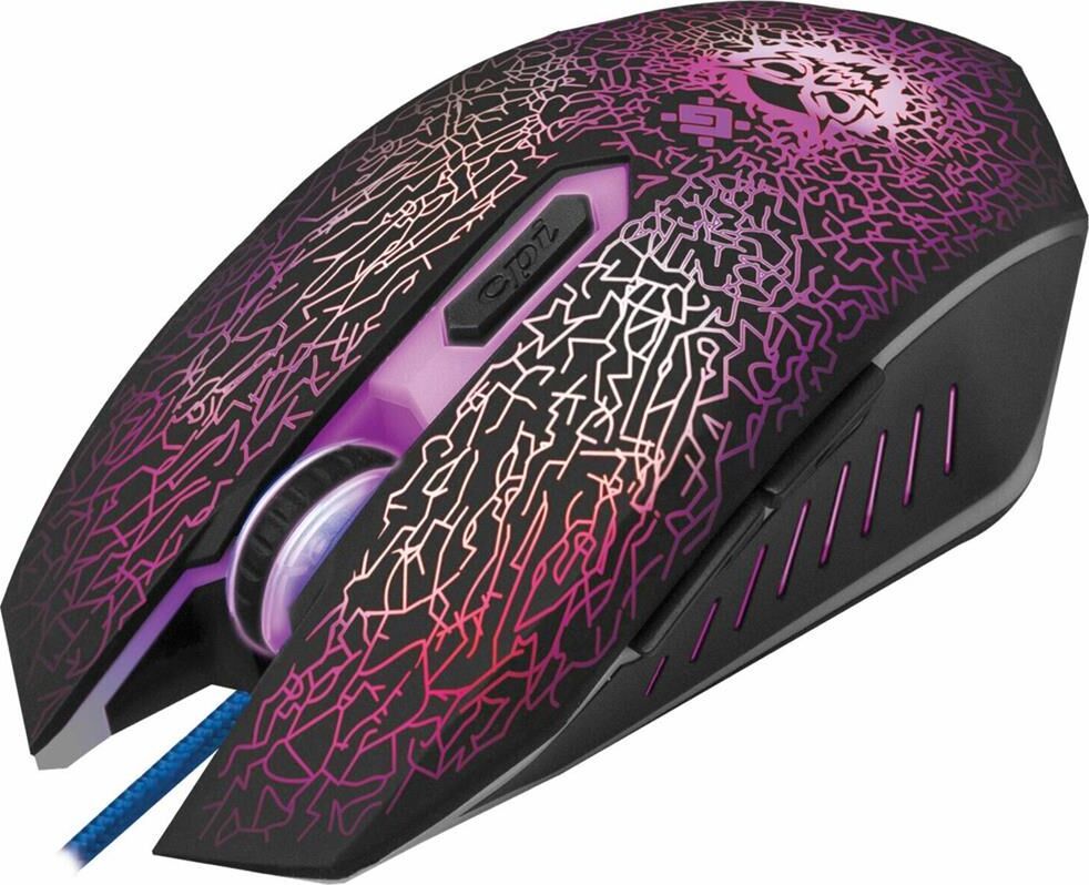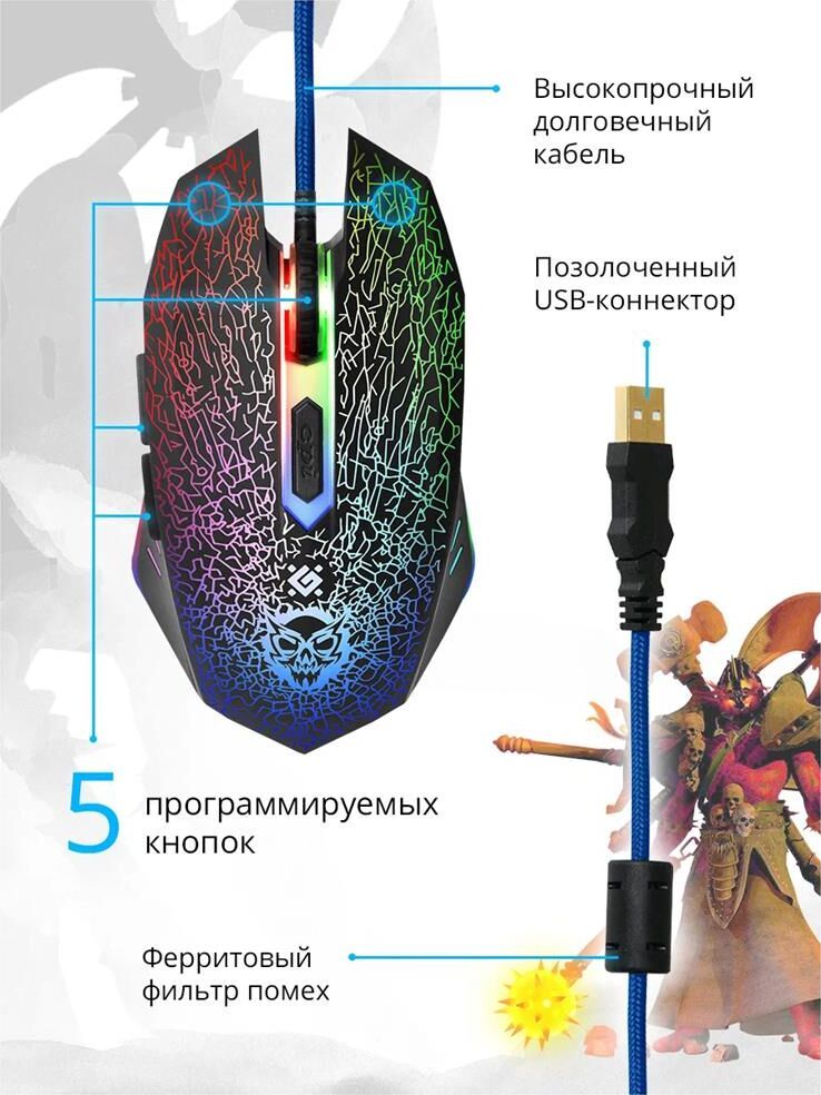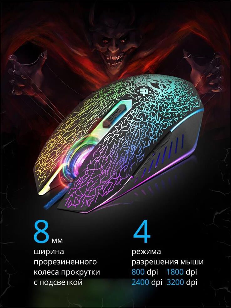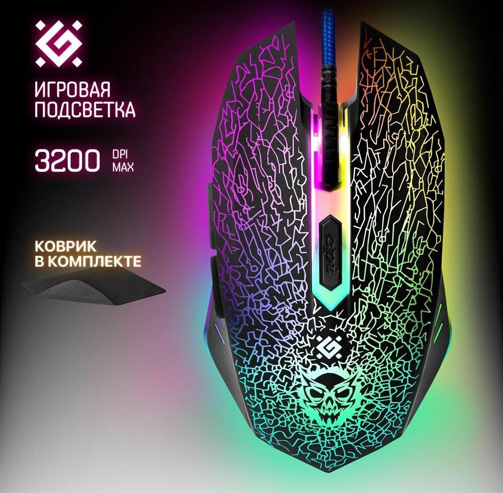 Игровой набор (мышь+коврик) , интерфейс подключения USB, количество кнопок - 5 + колесо-кнопка, тип сенсора - оптический, разрешение сменное - 800/1800/2400/3200 dpi, ферритовый фильтр помех, переливающаяся подсветка, прочное, приятное на ощупь прорезиненное покрытие.