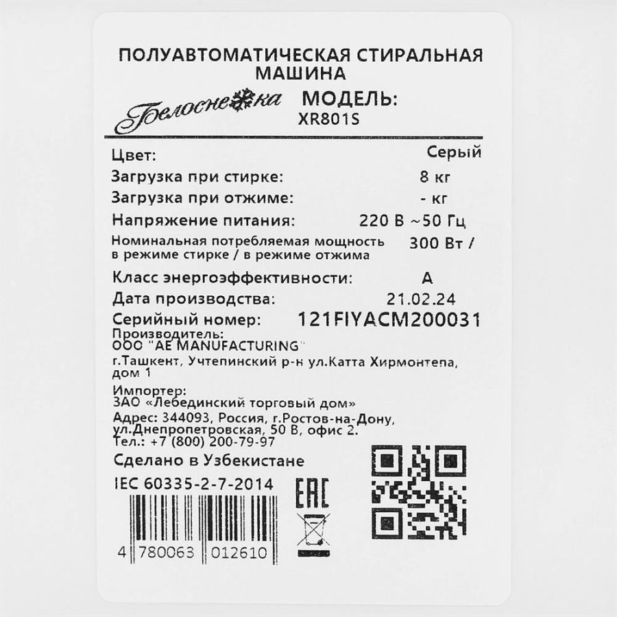 (ШхГхВ)52,4х44,5х84,5см.Цвет белый/серый.Загрузка белья для стирки и отжима, кг8.Тип двигателя стандартный.Установка отдельно стоящая.Класс энергопотребления A.Уровень шума при стирке, дБ 74.Количество программ 2. Программа стирки деликатных тканей.Тип управления механическое.Вес брутто, кг14.5.Страна-производительУЗБЕКИСТАН.