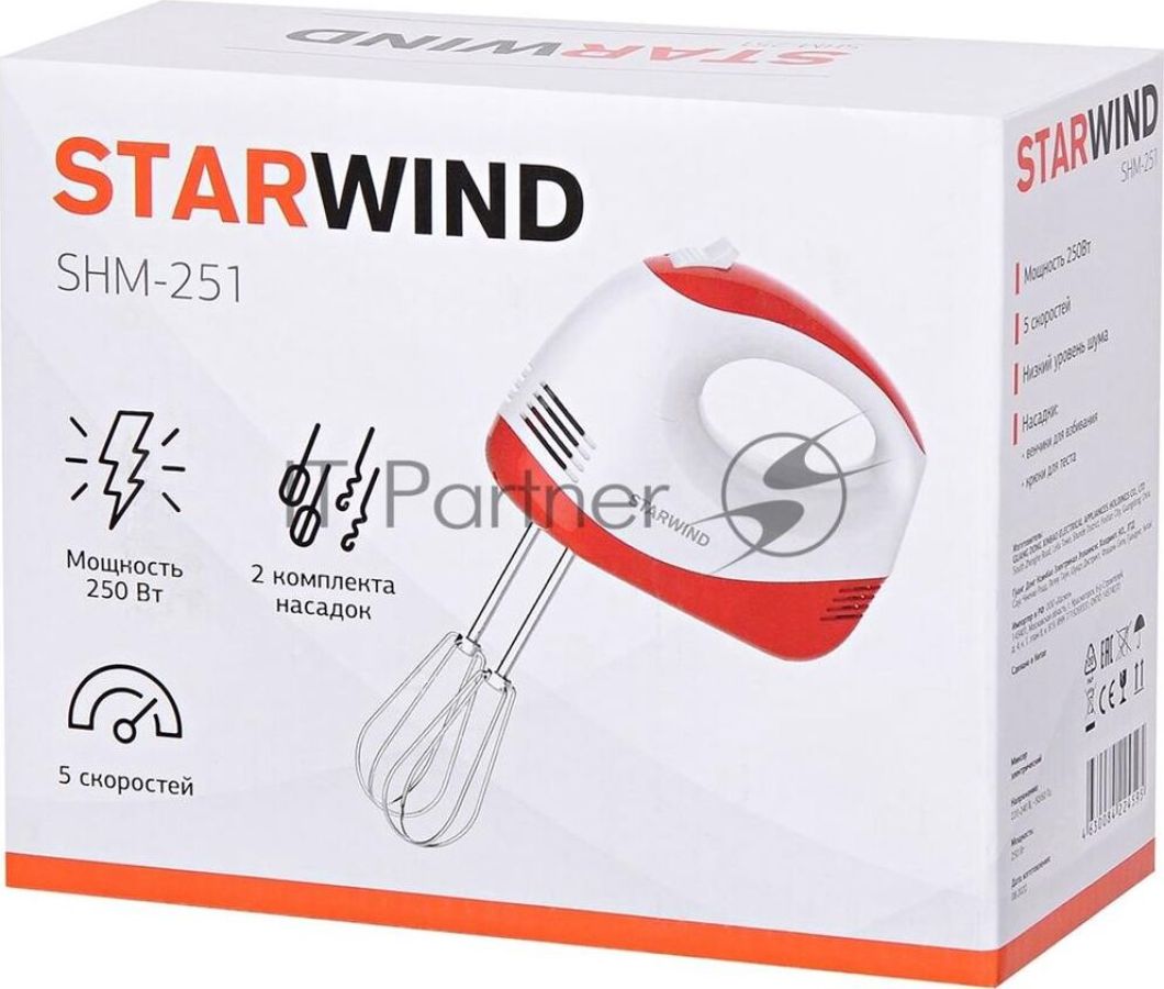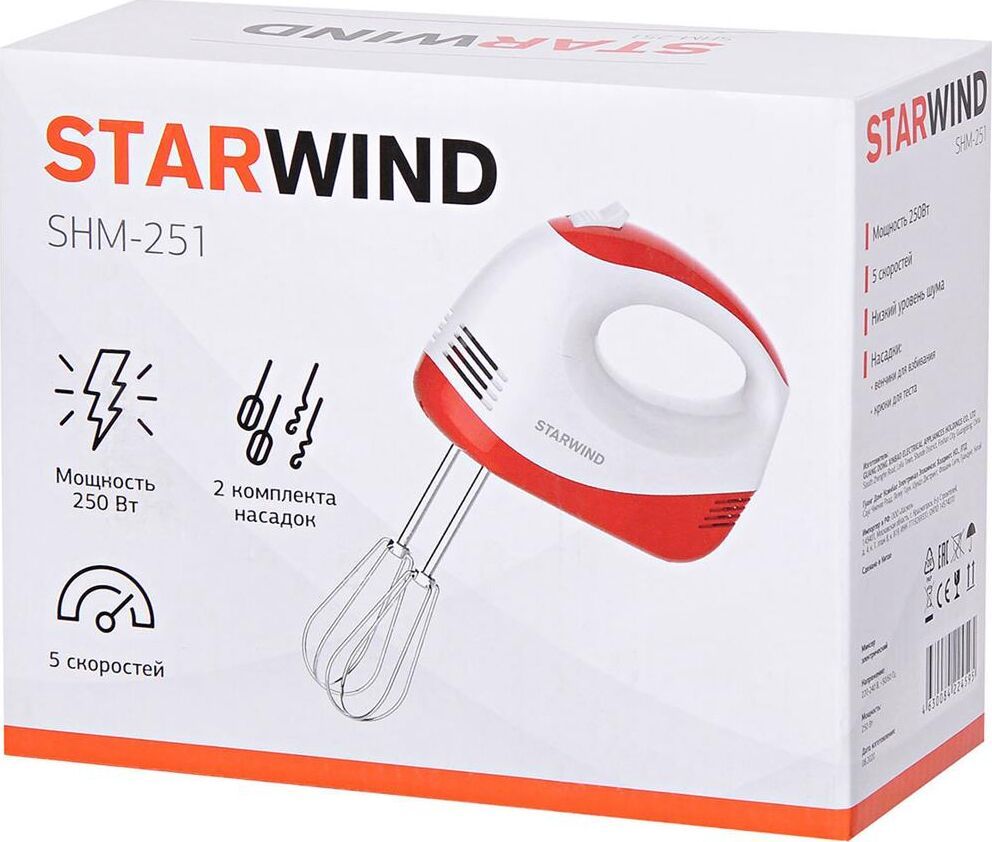 Тип ручной Мощность 250 Вт Количество скоростей 5 Венчик для взбивания Крюки для теста Цвет миксера белый, красный Габариты упаковки (ед) ДхШхВ 0.21x0.1x0.33 м Срок гарантии 12 мес.