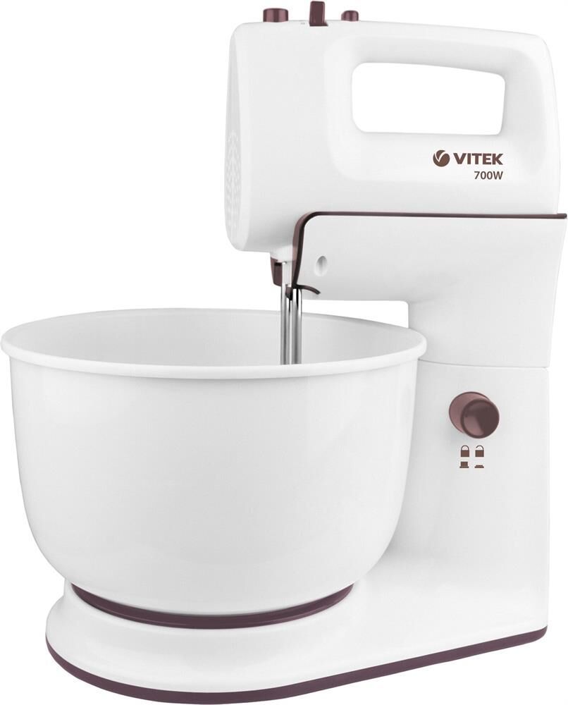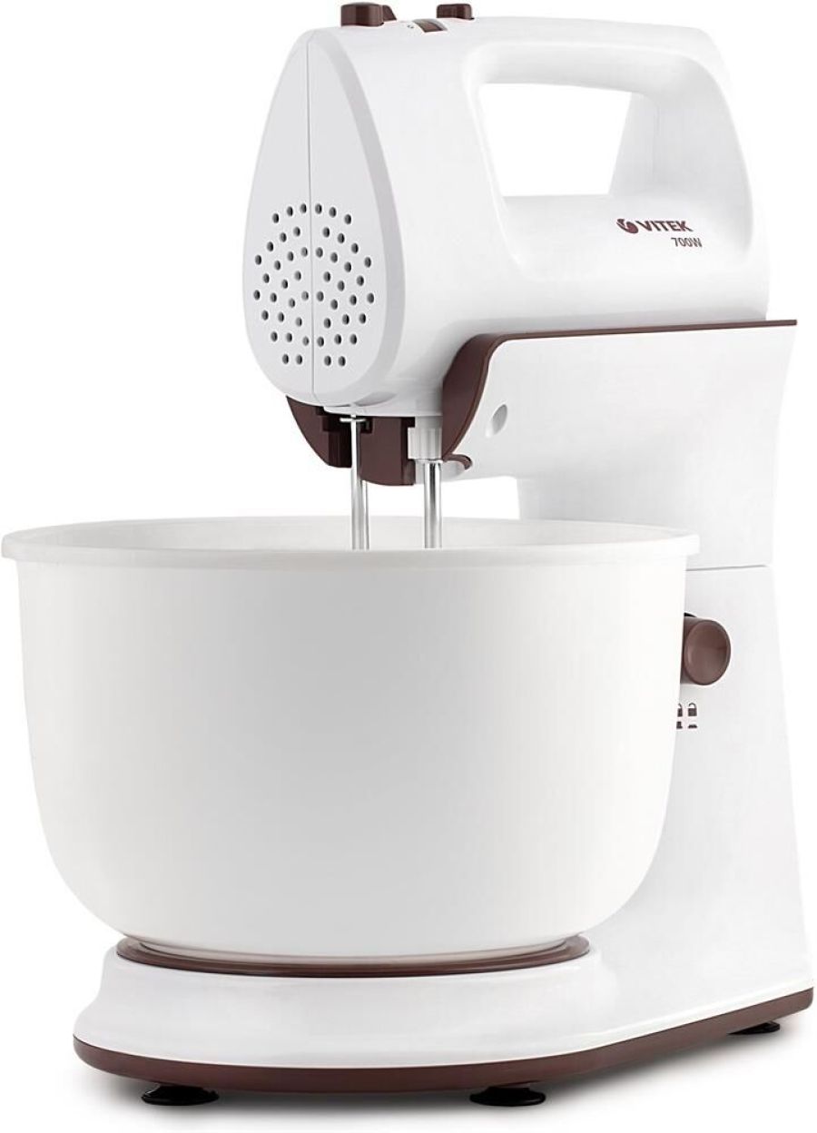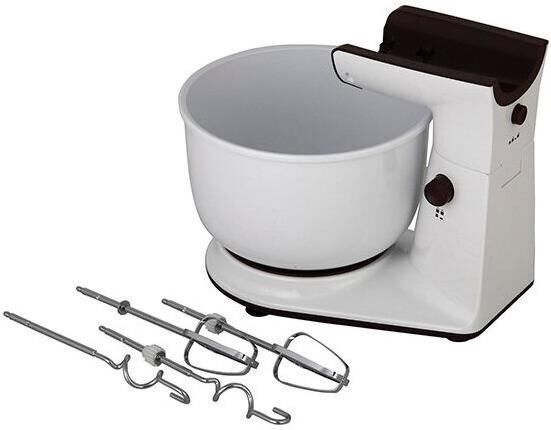 Миксер ручной с чашей. Мощность: 700 вт, Число скоростей: 5, Турборежим, Венчик для взбивания: 2, Крюки для замешивания теста, Количество насадок: 4, Вращение чаши, Материал чаши: пластик, Объем чаши: 4 литра, Кнопка отсоединения насадок, Материал корпуса: пластик, Длина сетевого шнура: 120 см, Цвет: Белый.