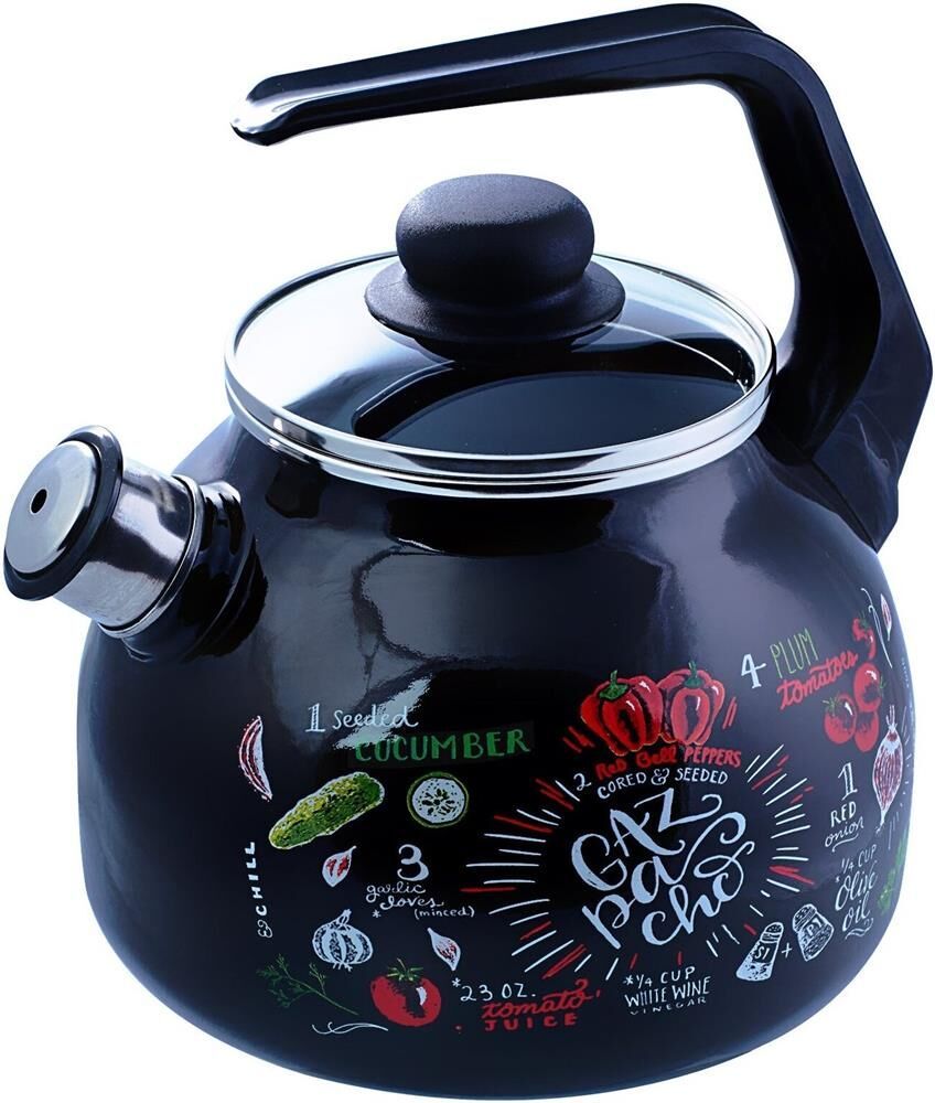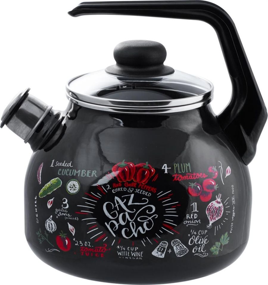Серия - Gazpacho Объем- 3 л. Высота - 24.5 см Диаметр дна - 16 см Со свистком- съемный Материал - нержавеющая сталь, материал крышки - стекло, материал ручки - бакелит Внутреннее и внешнее покрытие - эмаль Вид ручки - фиксированная Цвет - черный