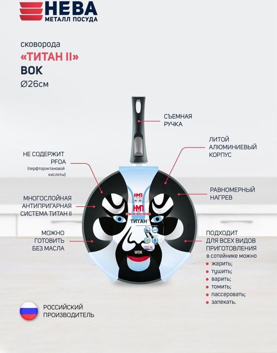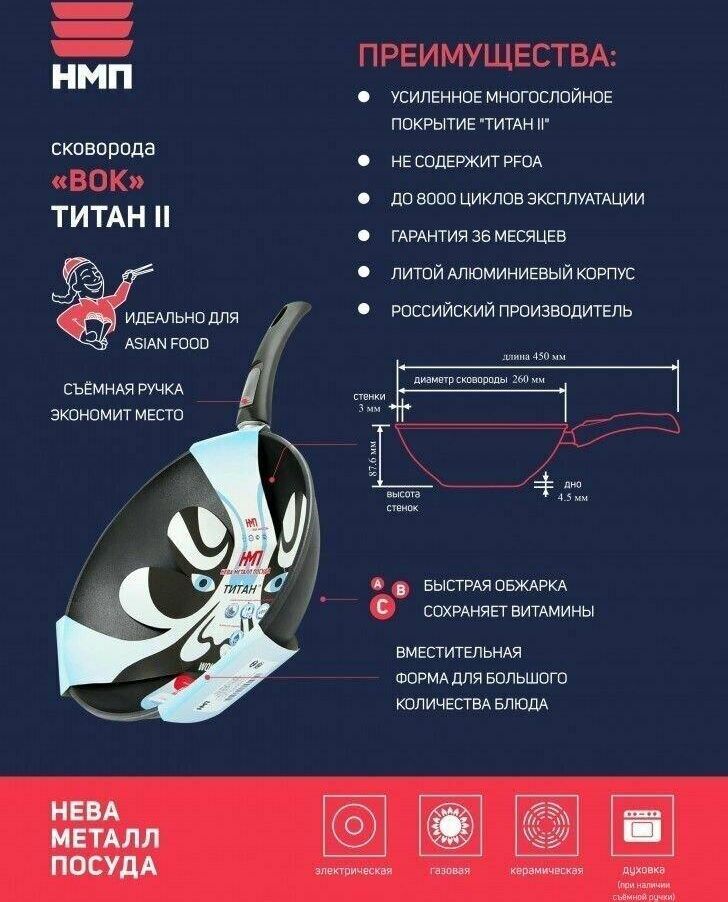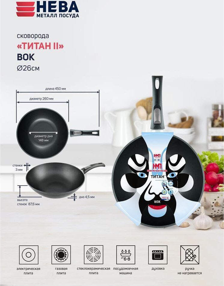 Тип покрытия Полимер-керамическое Диаметр изделия 26 см Диаметр дна 14.5 см Особенности Можно использовать в посудомоечной машине, Можно использовать в духовке, Съемная ручка Толщина дна 0.65 см Толщина бортов 0.25 см Форма Круглая Материал Литой алюминий Тип посуды ВОК Плита Газовая, Электрическая, Стеклокерамическая Высота бортов 87.6 мм Серия Титан Вес 1.2 кг