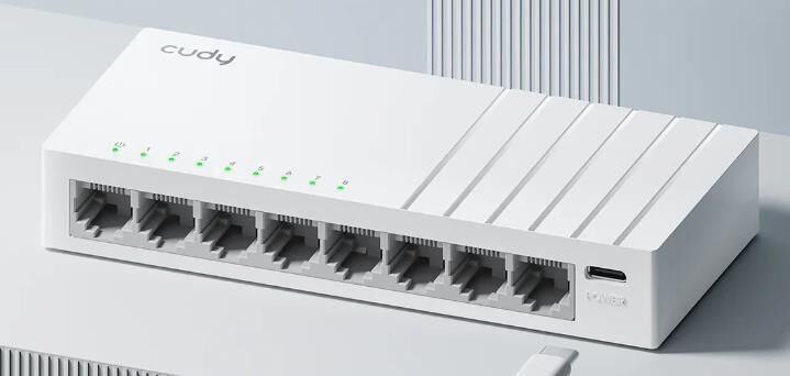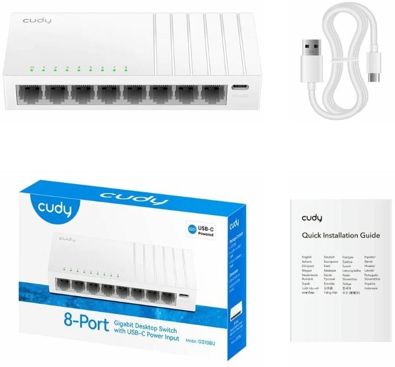 Неуправляемый сетевой коммутатор. Интерфейс: 8х гигабитных портов, LED-индикаторы, порт питания USB-C. Cat. 3+ 100м, 10 Мбит/сек; cat. 5+ 100м, 100 Мбит/сек; 5е+ 170м, 1000 Мбит/сек. Потребляемая мощность: 4Вт (максимум), 1.18Вт (в режиме ожидания). Максимальная скорость передачи данных: 11.904 Mpps. Максимальная коммутационная способность: 16 Мбит/сек. Jambo-кадр: 9 КБ. Буфер пакетов: 1 Мбит. Функция энергосбережения. Пластиковый кейс. Настольная и настенная установка. Питание: 5В, 0.8А (DC), USB Type-C, кабель питания в комплекте