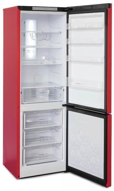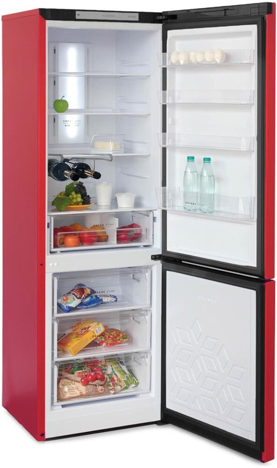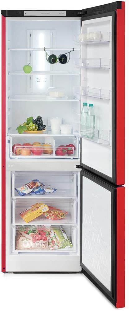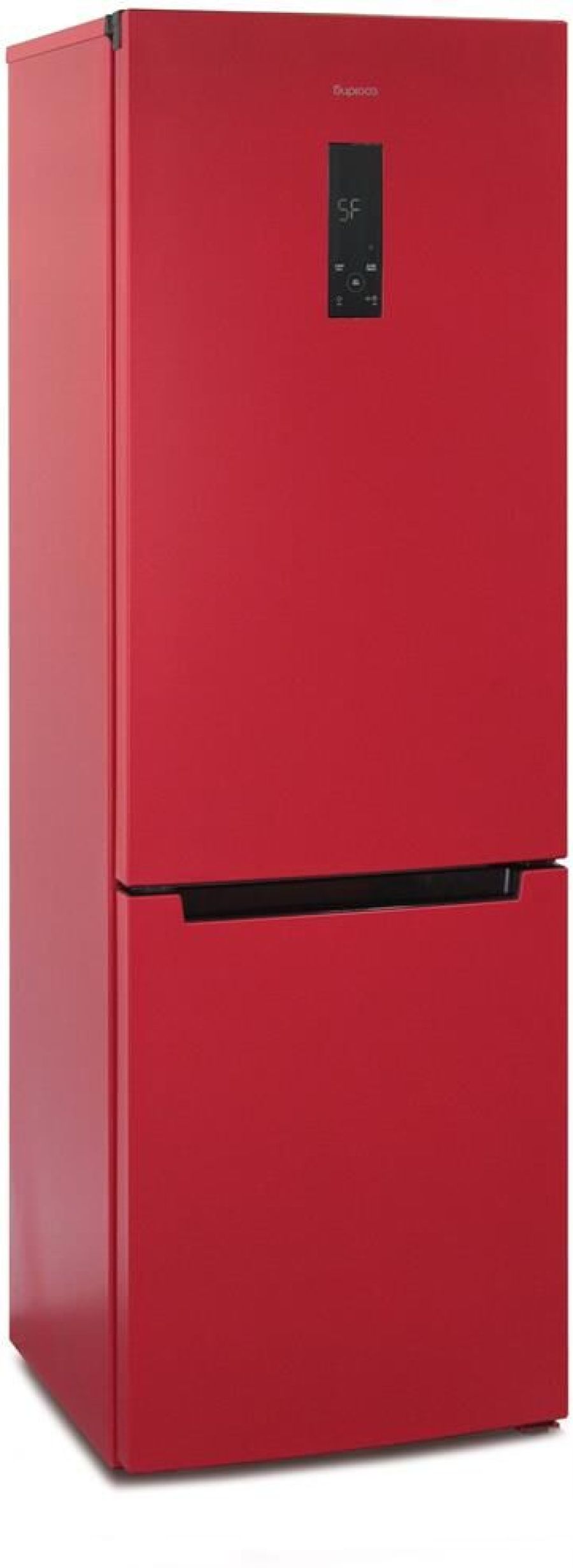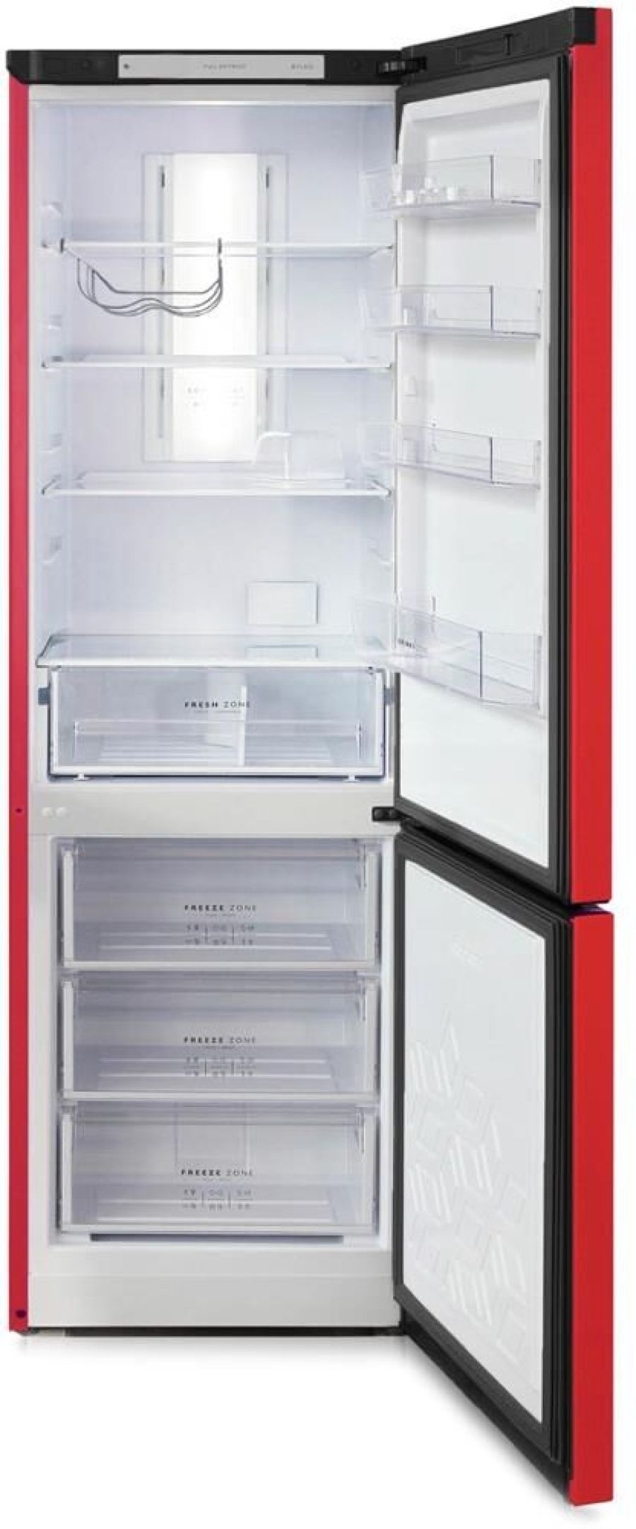 Двухкамерный холодильник с нижней морозильной камерой с системой Full No Frost с дисплеем на двери • цвет Красный • LED дисплей на двери • система охлаждения Multi Air Flow • регулировка влажности Humidity control • единая зона для овощей и фруктов Fresh Zone с разделителем • полка для бутылок, масленка • LED освещение • электронное управление • габариты 190х60х62,5см • объем 340/240/100л