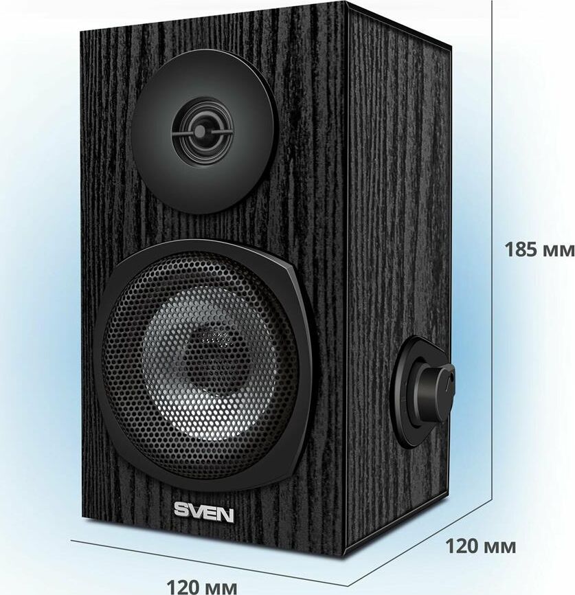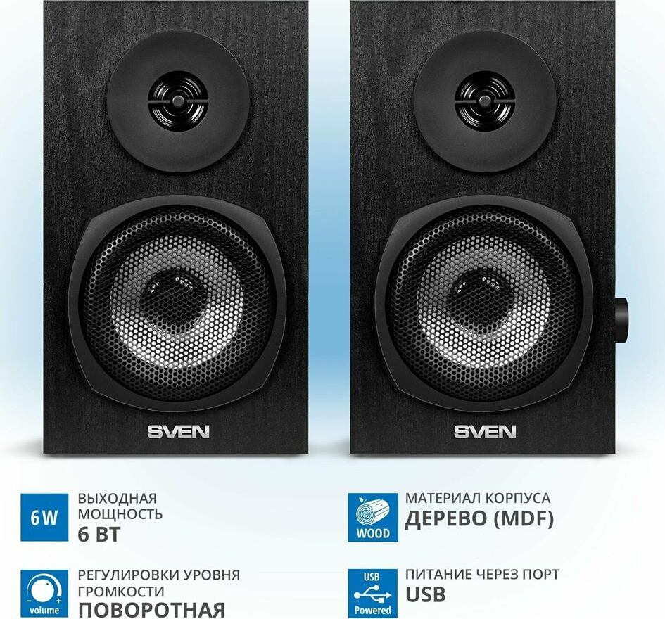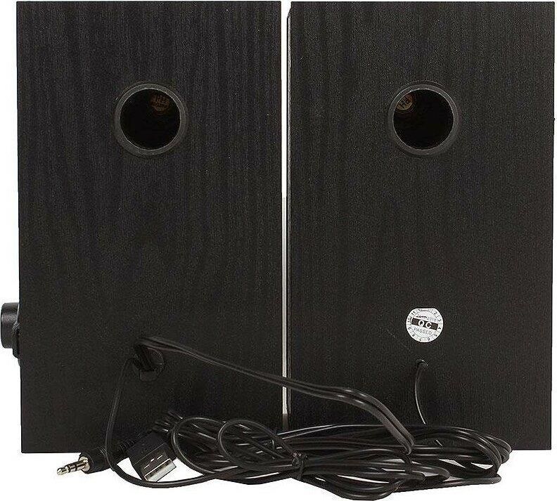 Акустическая система мултимедийная, выходная мощность 6Вт (2х3Вт), частотный диапазон 80-20000 Гц, ВЧ-излучатель для детального воспроизведения высоких частот, регулировка уровня громкости, питание через USB-порт ПК, ноутбука или адаптер 5V DC, материал корпуса колонок – дерево (MDF)