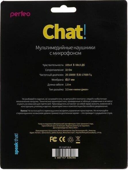Стерео гарнитура накладная CHAT, Мембрана, мм: 27, Разъем: 3.5мм / мини-джек, Длина кабеля, м: 1,8.